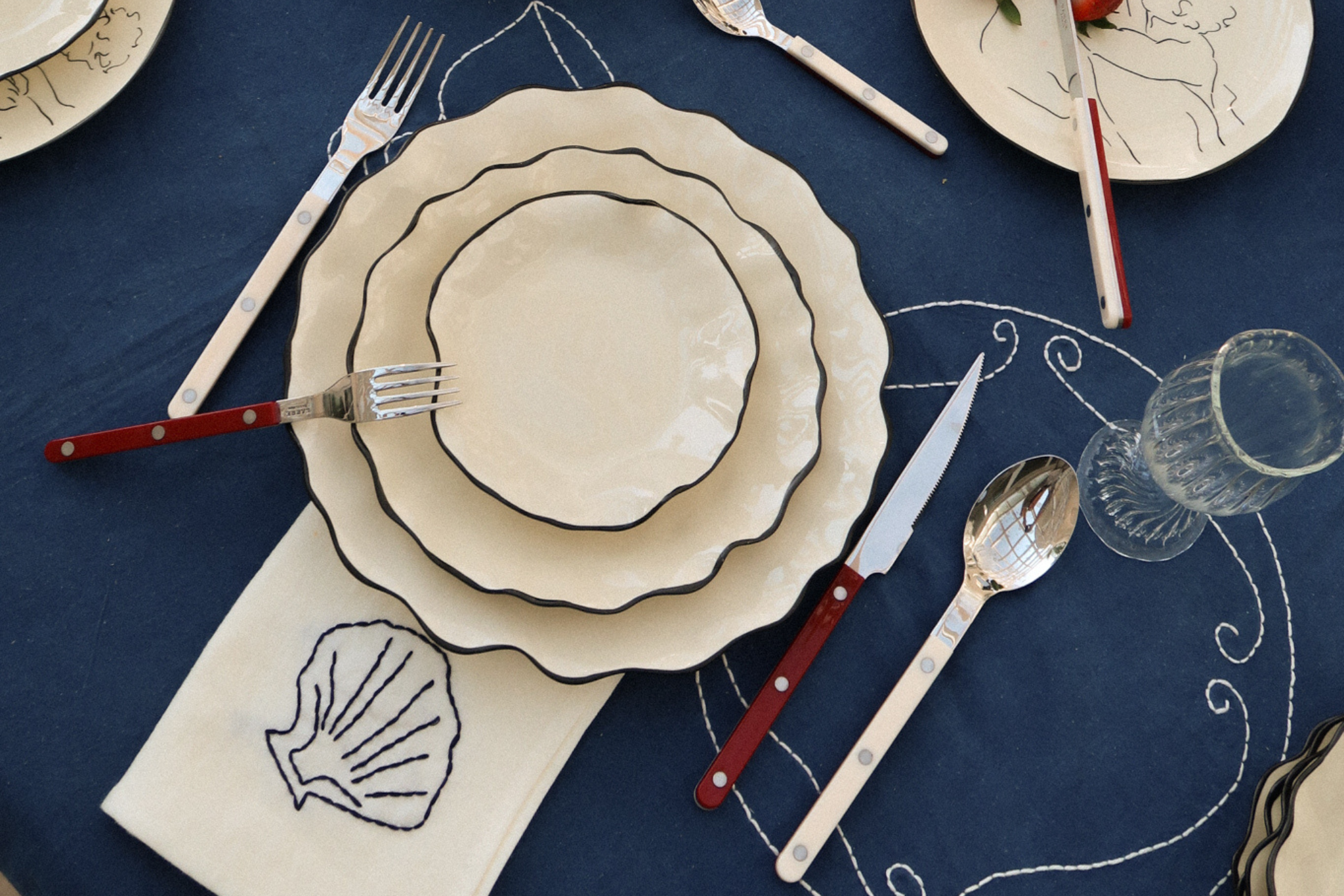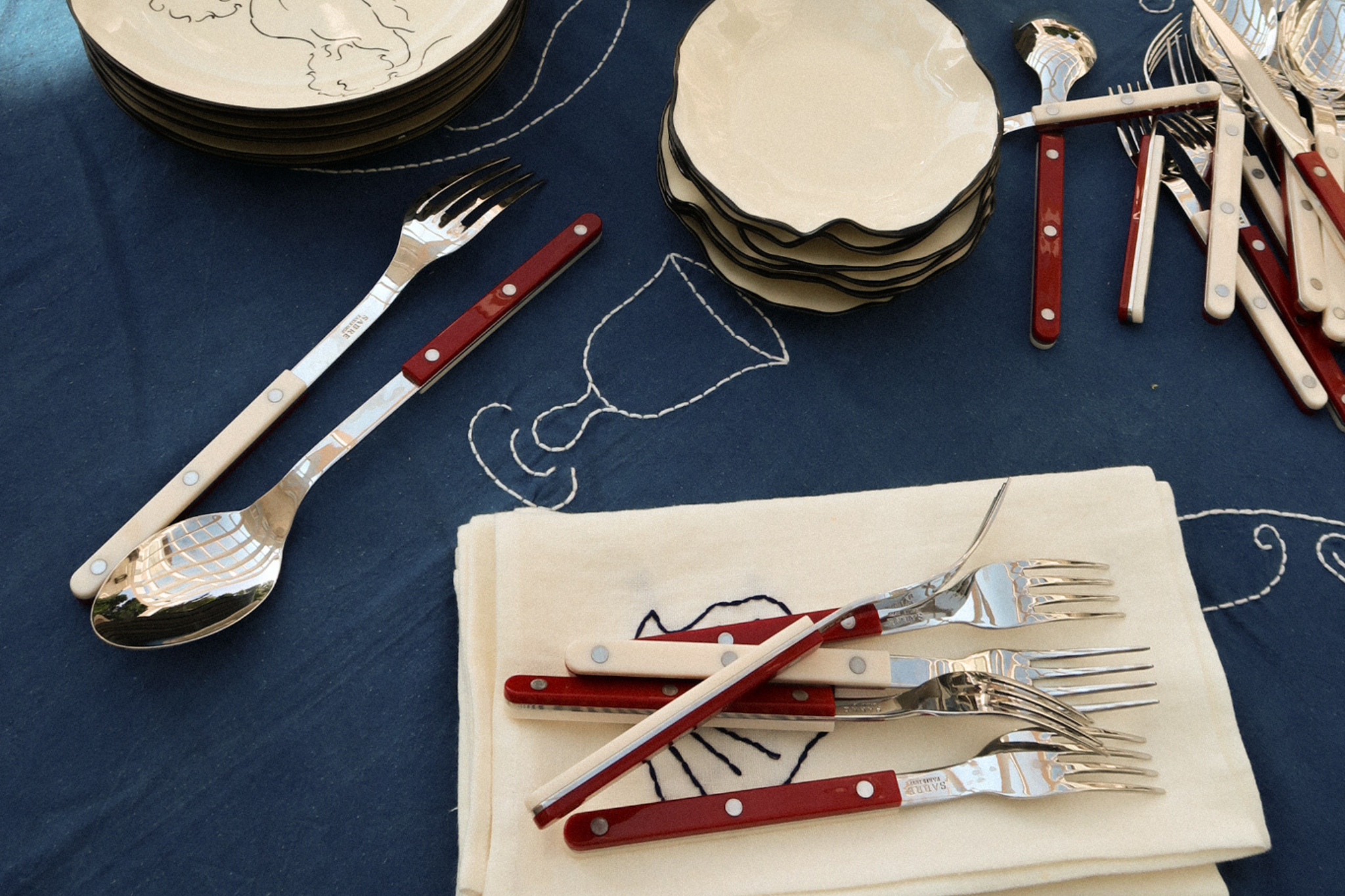 This Sabre Paris Bistrot 5-piece flatware set brings the relaxed elegance of European café culture to your table. Featuring the curated LES Collection colors, each piece showcases vibrant hues with different shades on each side—cream on the front and burgundy on the back—perfect for creating layered, expressive table settings that feel both effortless and intentional.