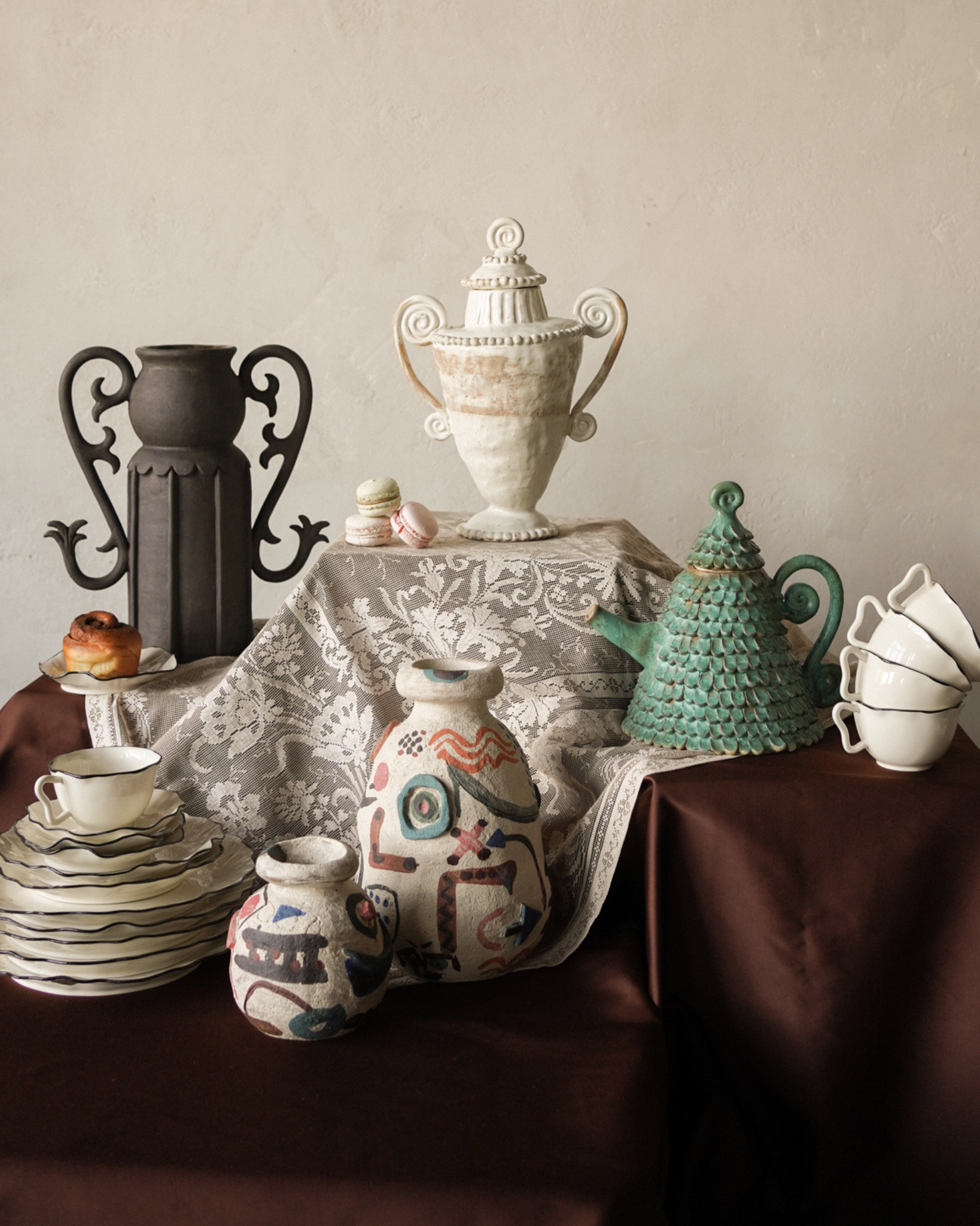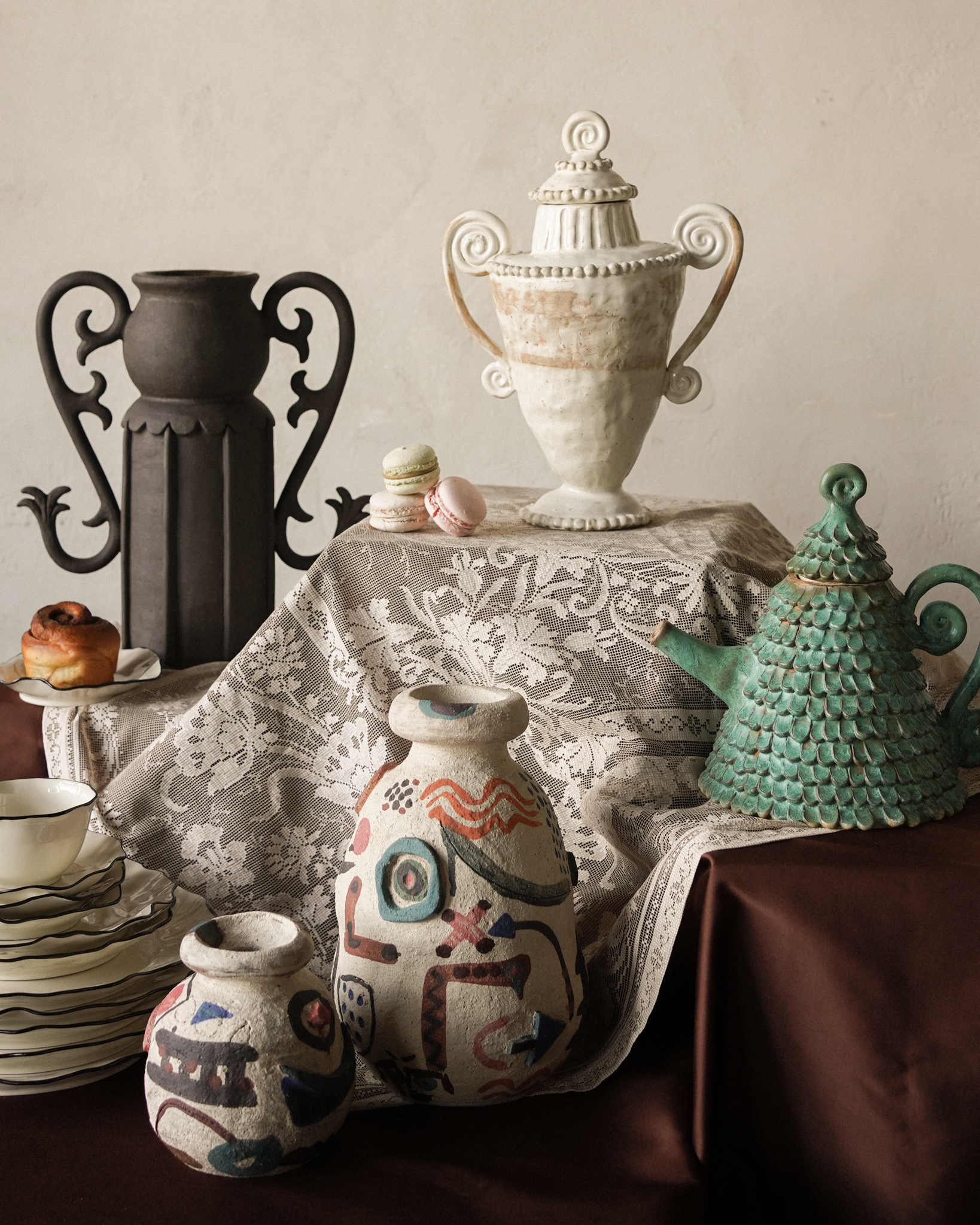 The vessel's dramatic rippled collar and spiraling handles pay homage to the opulent decorative arts of the past, infused with a profound sense of romanticism and humanistic emotion. Sivim Ly, a Cambodian designer and ceramicist, creates works that merge softness with whimsical elegance through her combined slab and coiling techniques, resulting in pieces that feel both timeless and distinctly contemporary.