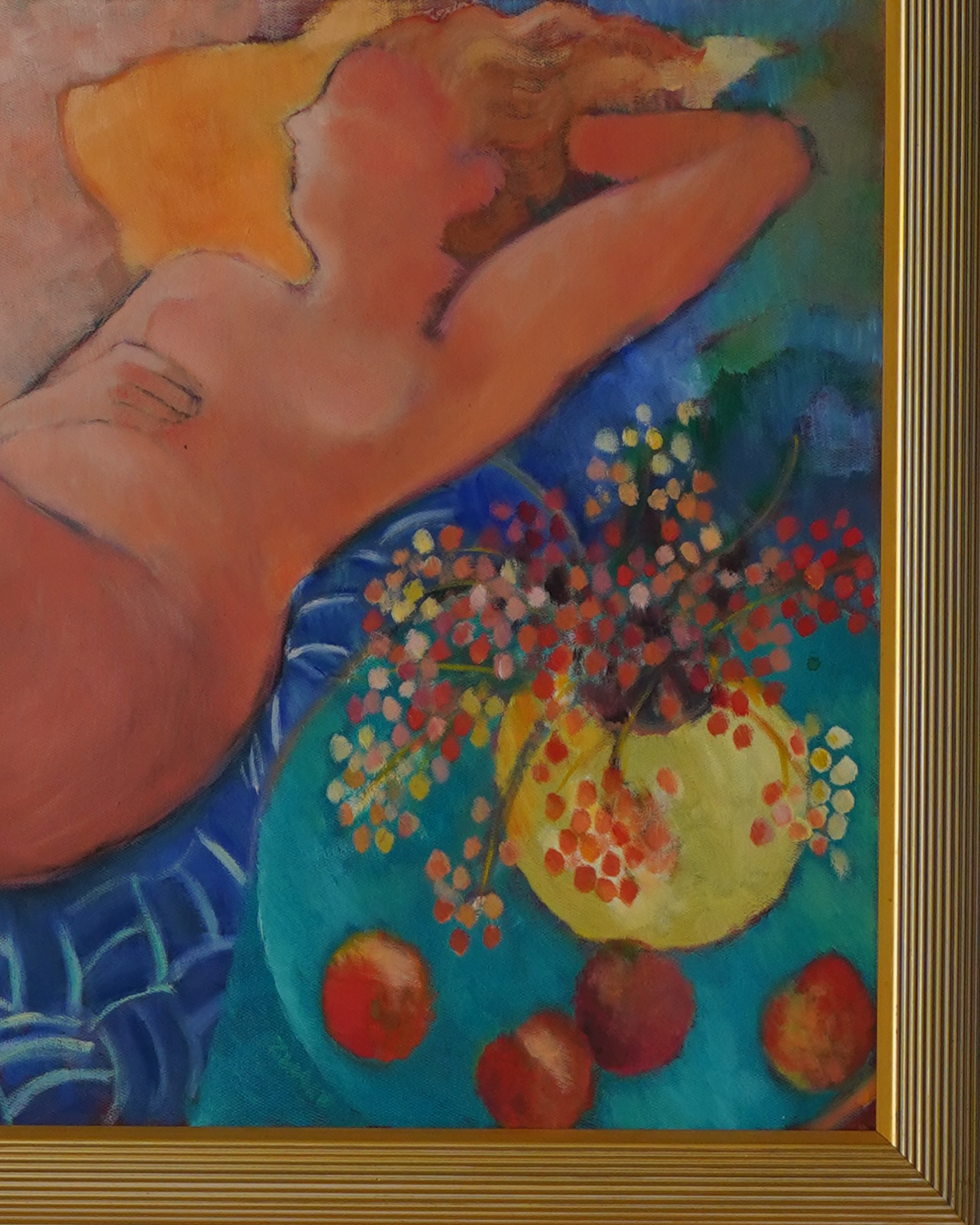 Bold color and dynamic composition capture the spirit of 1920s Art Deco in this painting. The vibrant palette and ornate frame with pink, blue, and turquoise accents embody the era's celebration of modern design.