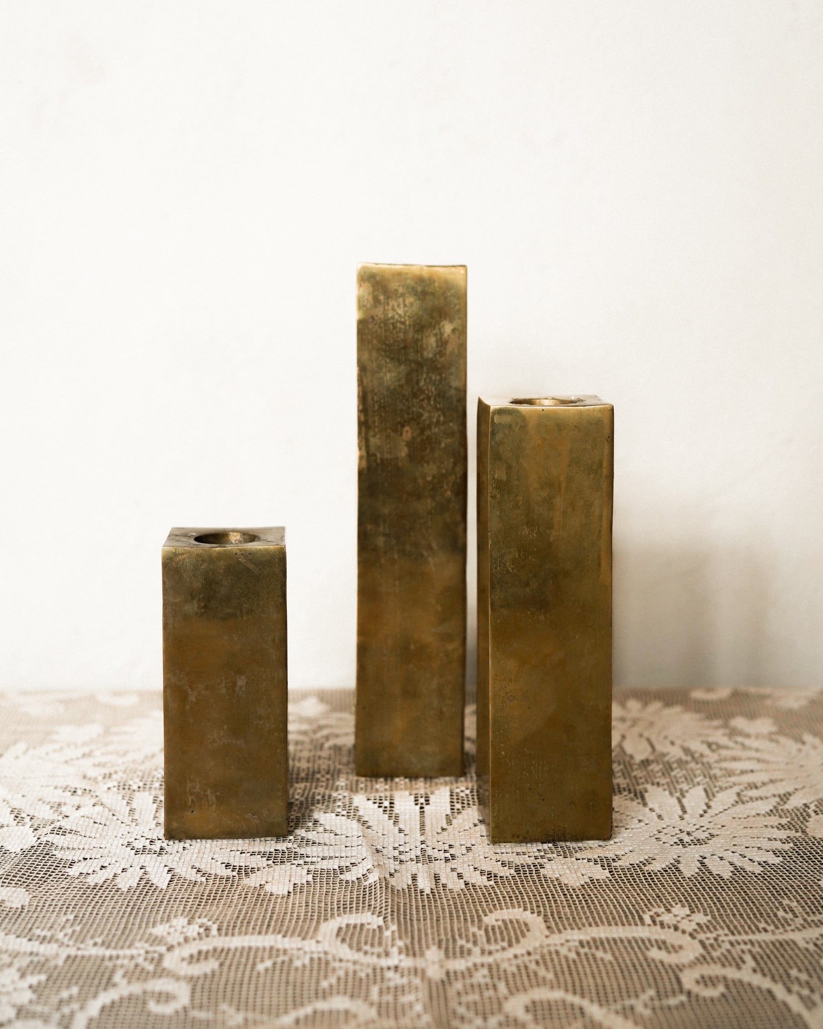 Three graduated brass forms with geometric block silhouettes and a polished gold finish. The sculptural shapes hold their own without a candle in sight. Group all three on a dining table or scatter them across a mantel for a layered look.