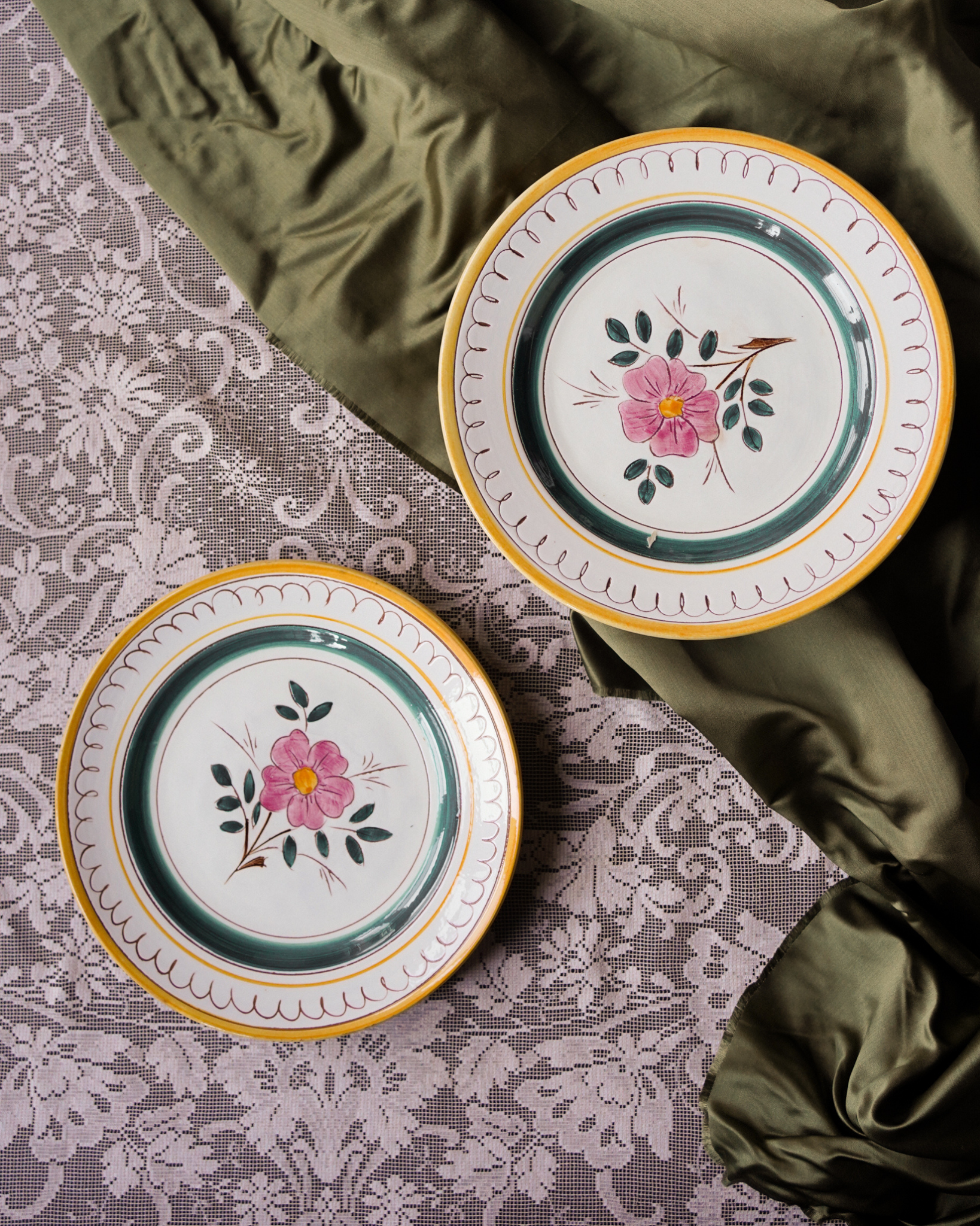 Garden flowers come alive across this collection of eight hand-painted plates. The colorful botanical patterns reflect folk art traditions that defined mid-century ceramic design.