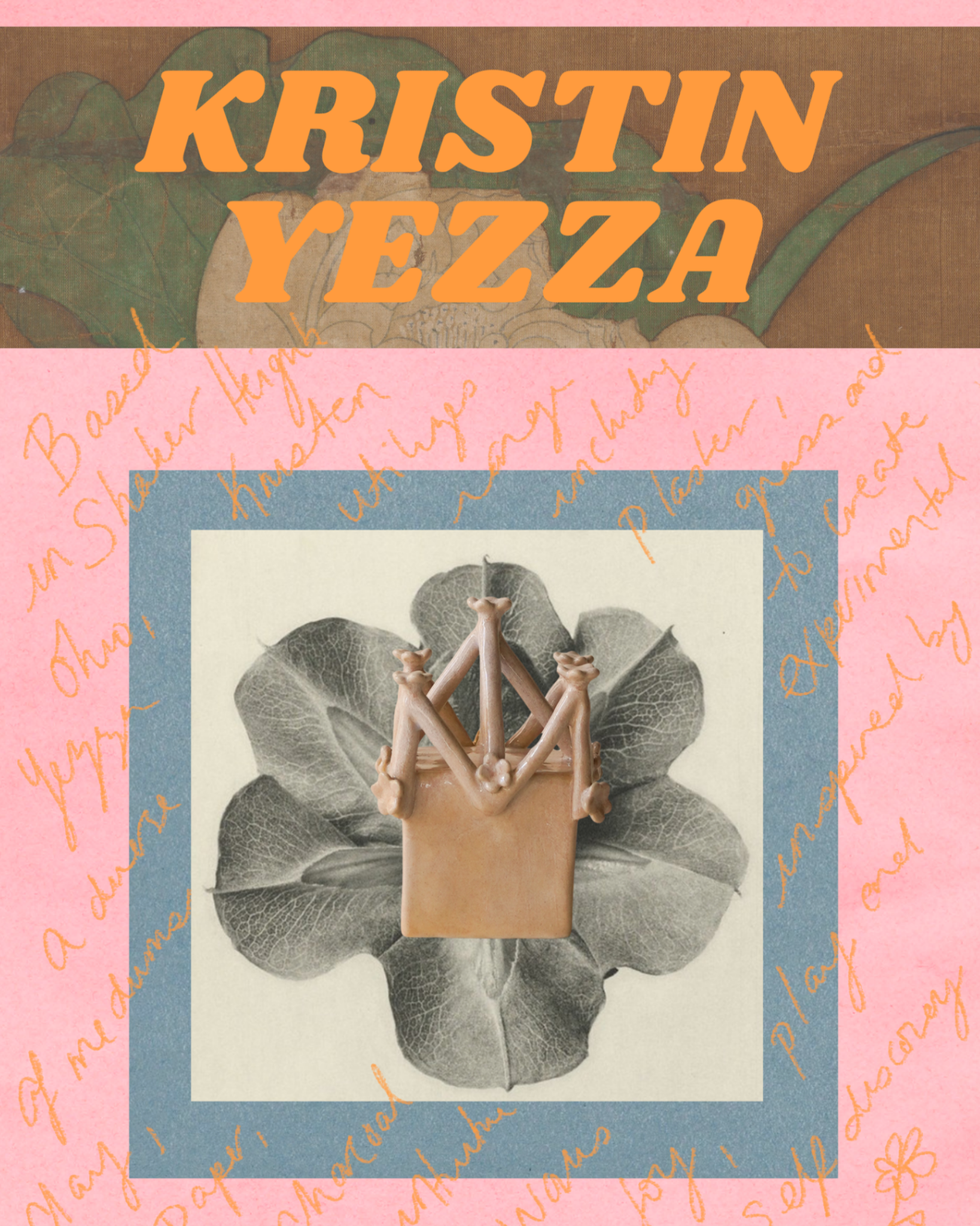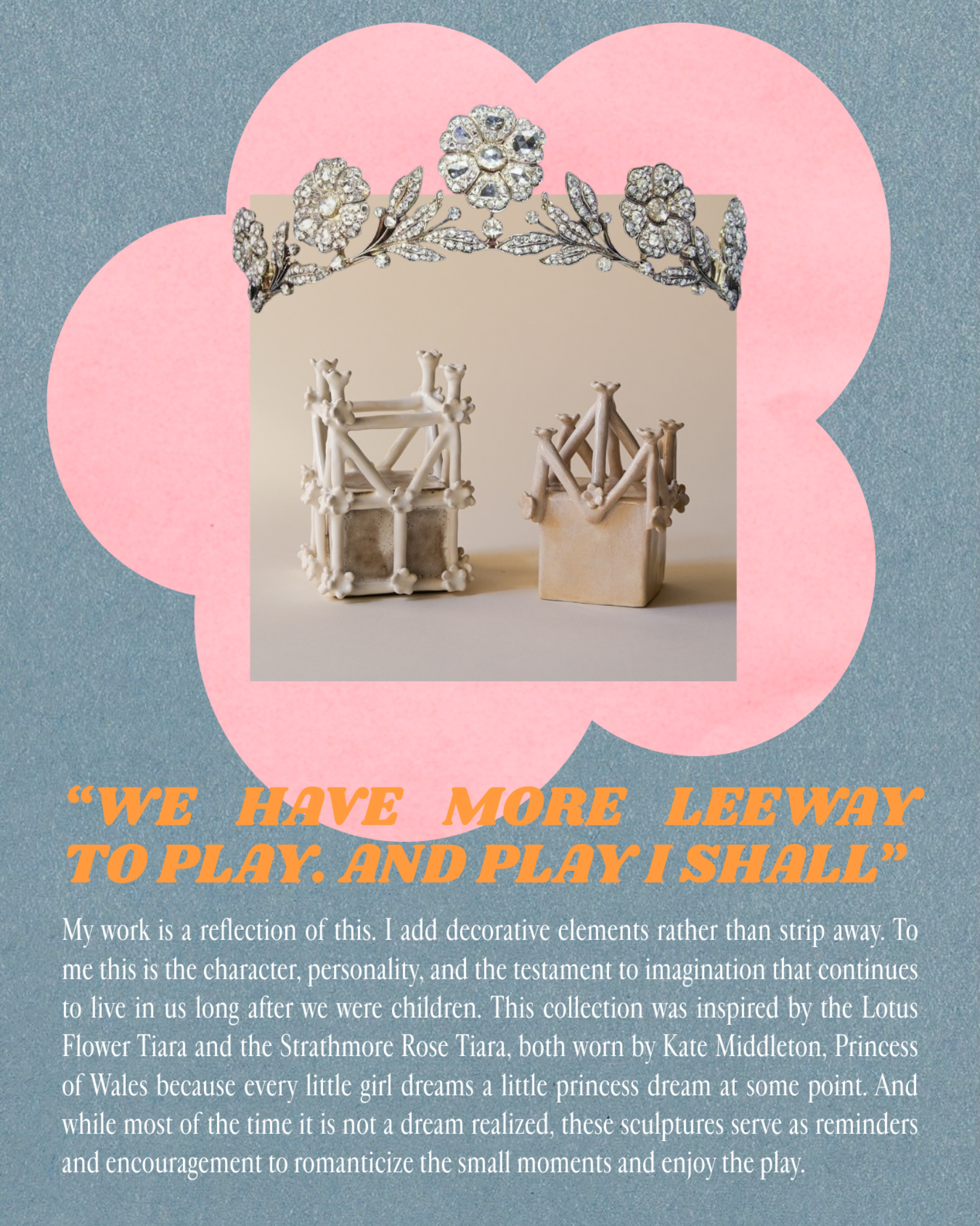 A ceramic sculpture with a structural, cage-like form adorned with small flower-shaped details and a matte white finish. Yezza's collection was inspired by the Lotus Flower Tiara and the Strathmore Rose Tiara, both worn by Kate Middleton. "Every little girl dreams a little princess dream at some point," she writes. "These sculptures serve as reminders and encouragement to romanticize the small moments and enjoy the play."