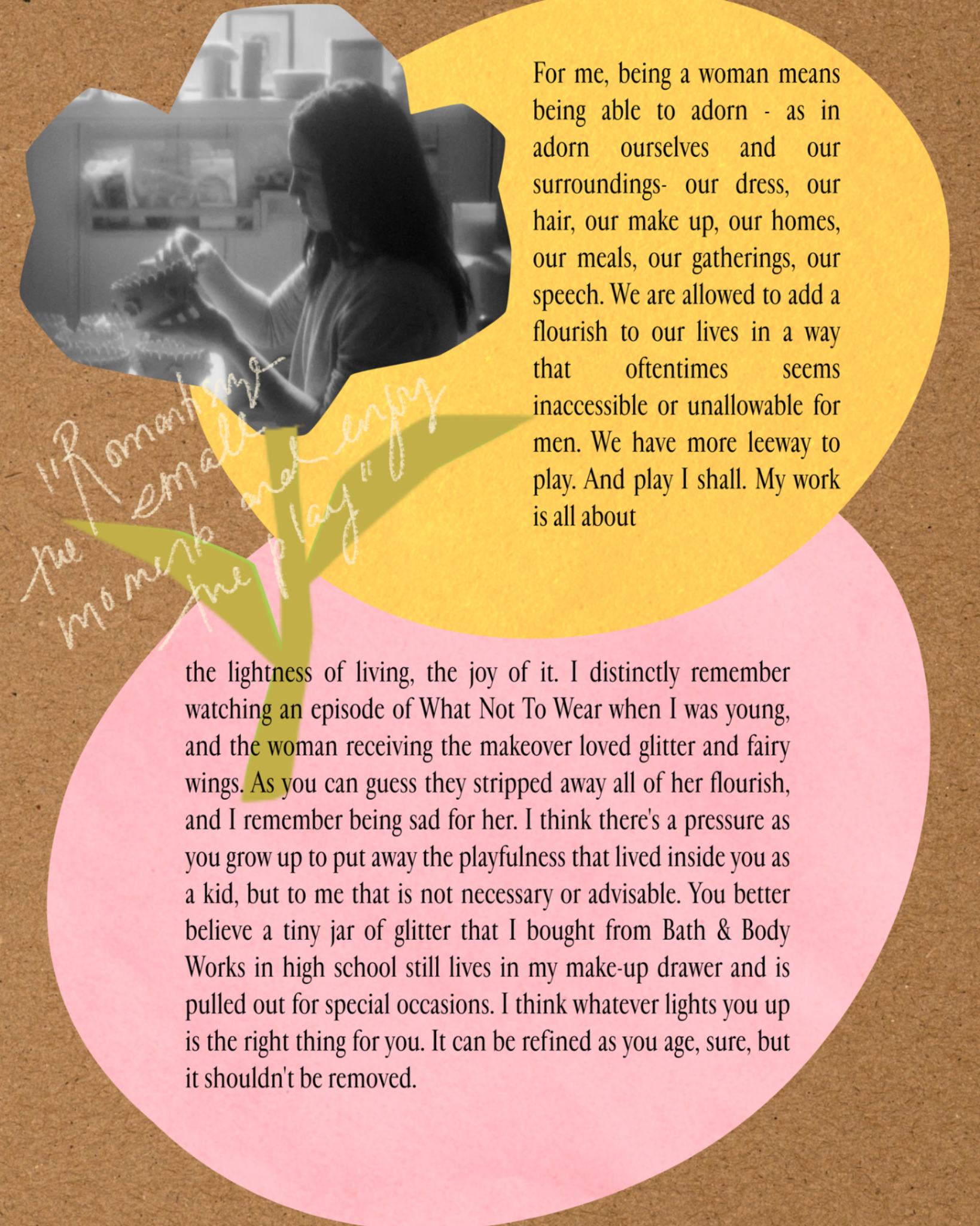 For Yezza, being a woman means being able to adorn, to add decorative elements rather than strip away.