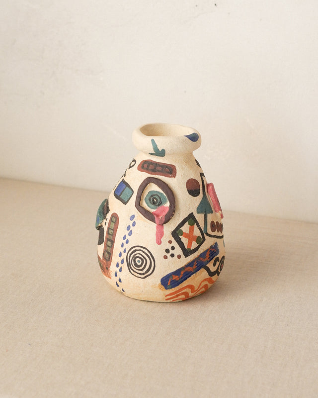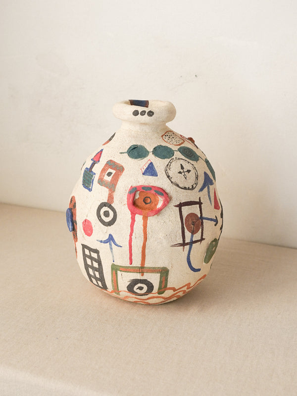 This hand-built ceramic vessel from Justin Hoffman's Ancient Modernism series features intricate layers of wild slips from Japan and California, combined with various oxides and stains. The piece undergoes multiple firings to achieve its distinctive patina, evoking the sense of being unearthed from a distant era.