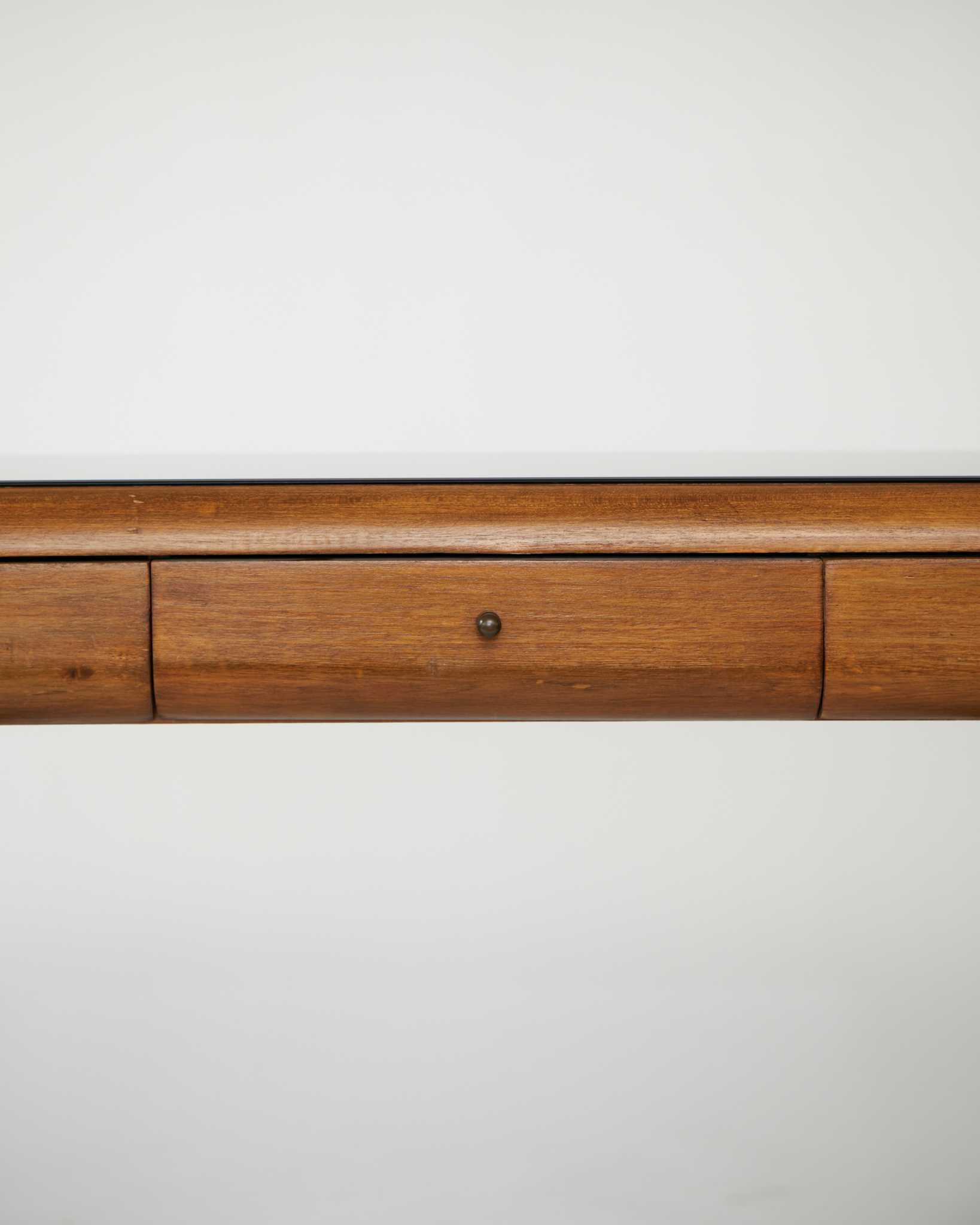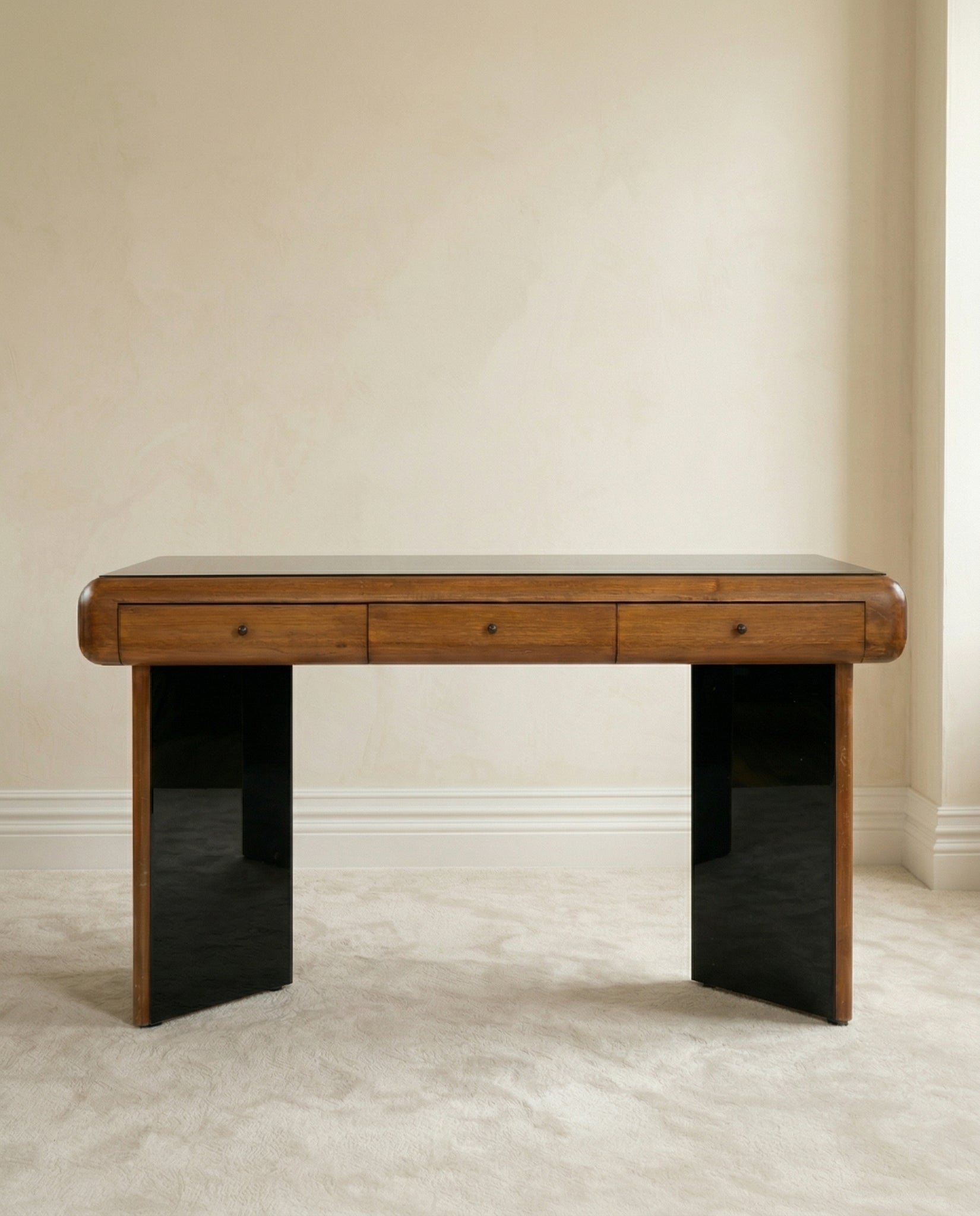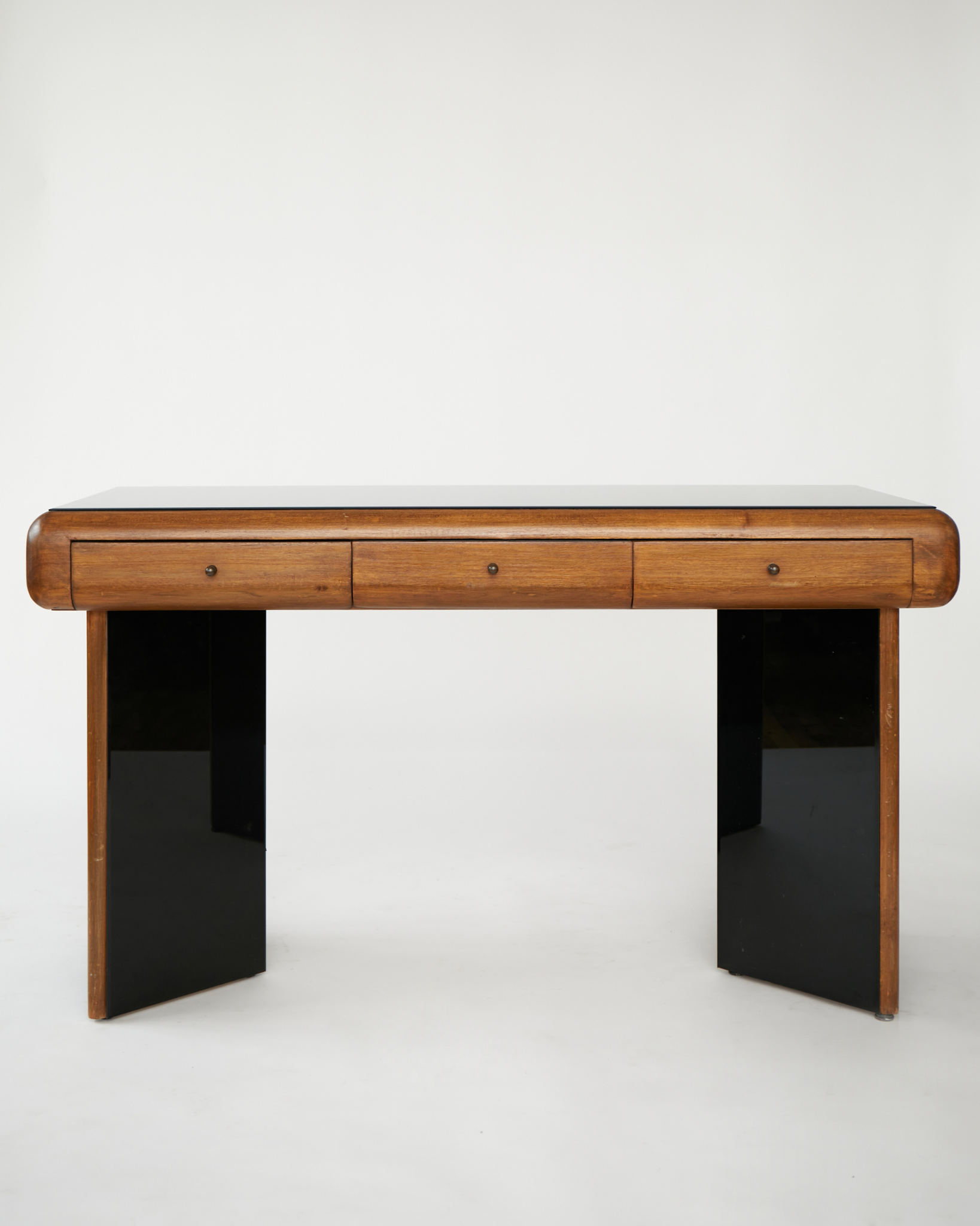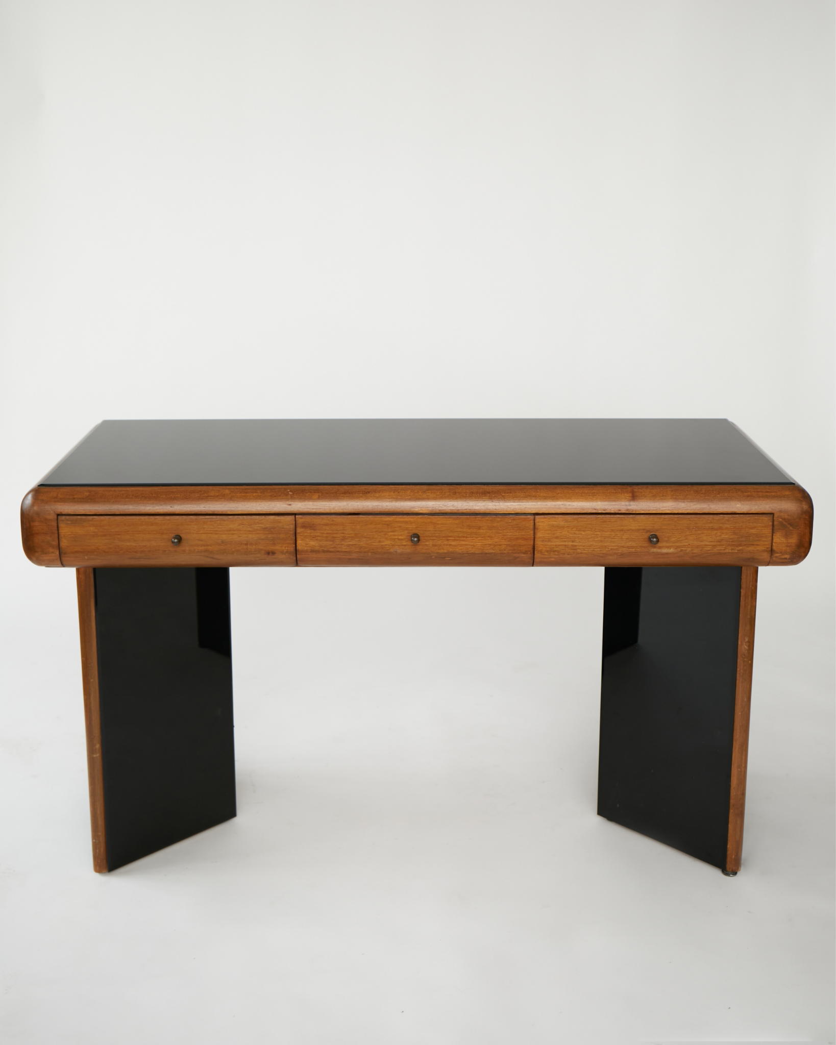 Walnut wood meets glossy black glass in this Art Deco console that works as desk or entry table. The dark reflective surface against warm wood creates sophisticated material contrast, perfect for displaying objects or anchoring a hallway with refined presence.