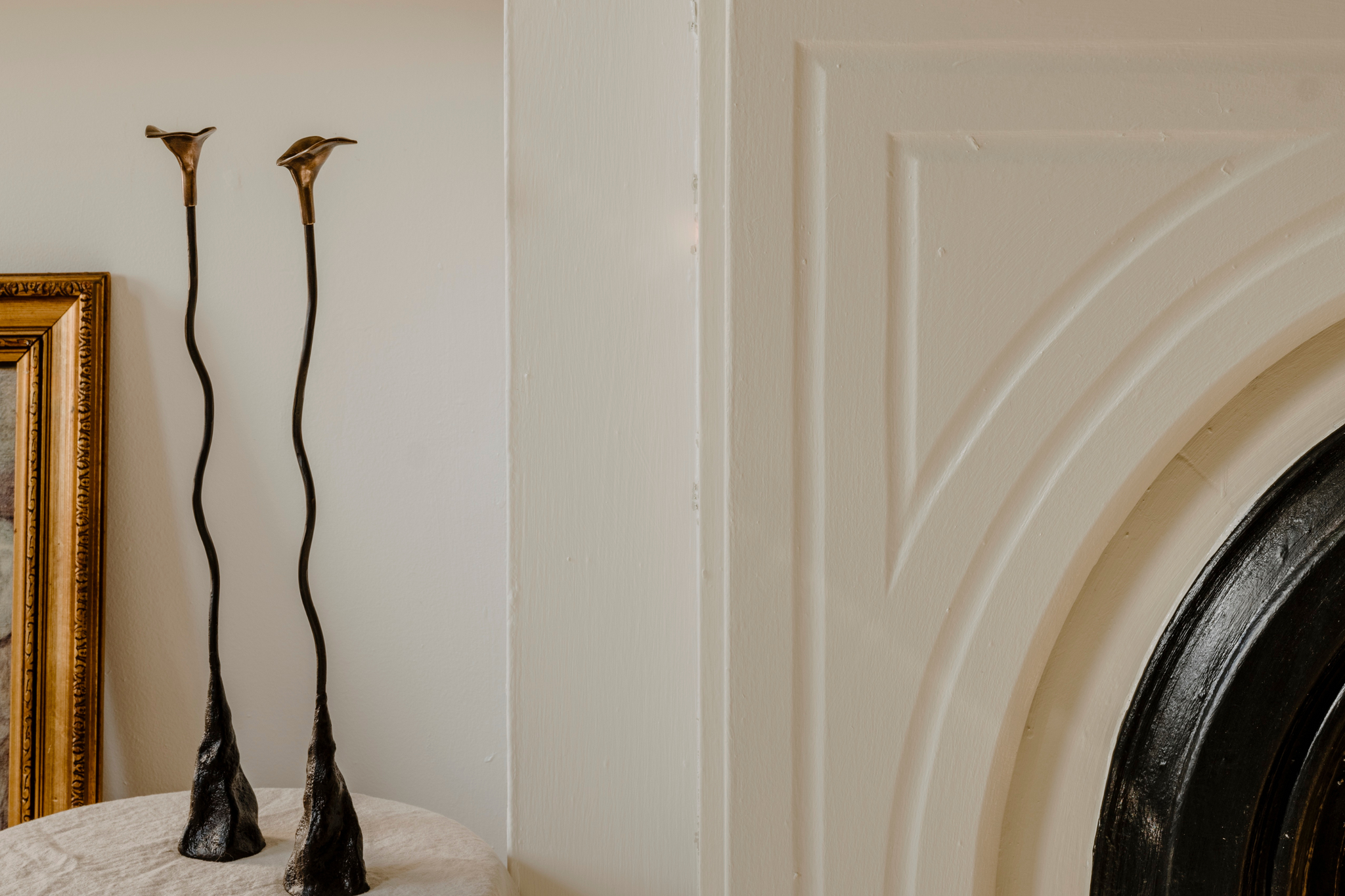 Callas is a set of handmade iron candlesticks from The Iron Series. With airy stems and hand-formed bases, this pair of taper candle holders are in full bloom with a beautiful bronze calla lily at the top. Built to house two taper candlesticks, the sculptural set may also be styled as objet d'art on their own.