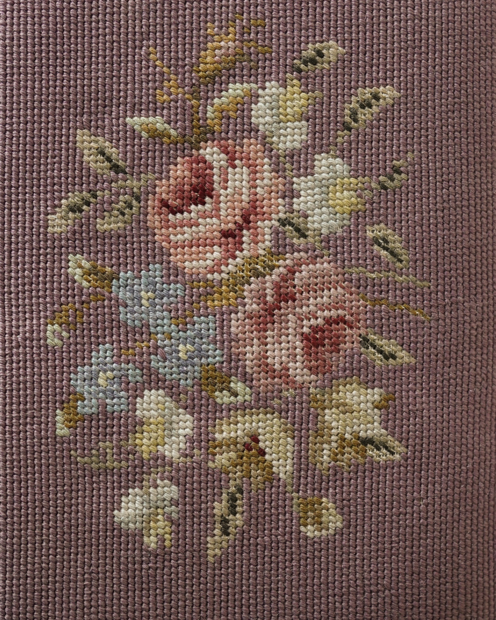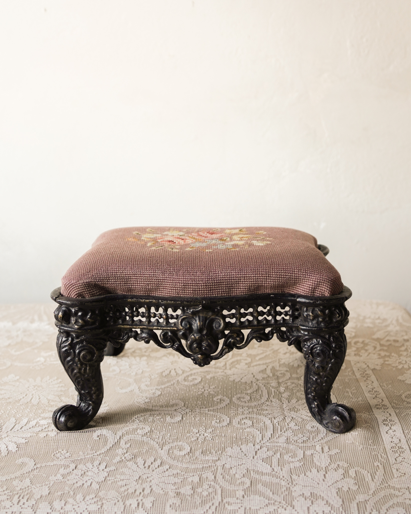 Substantial cast iron construction and skilled needlework define this vintage footstool. The durable metalwork and functional form provide enduring utility.