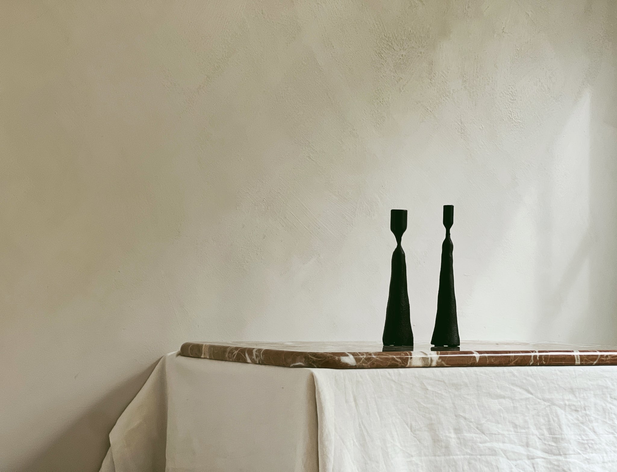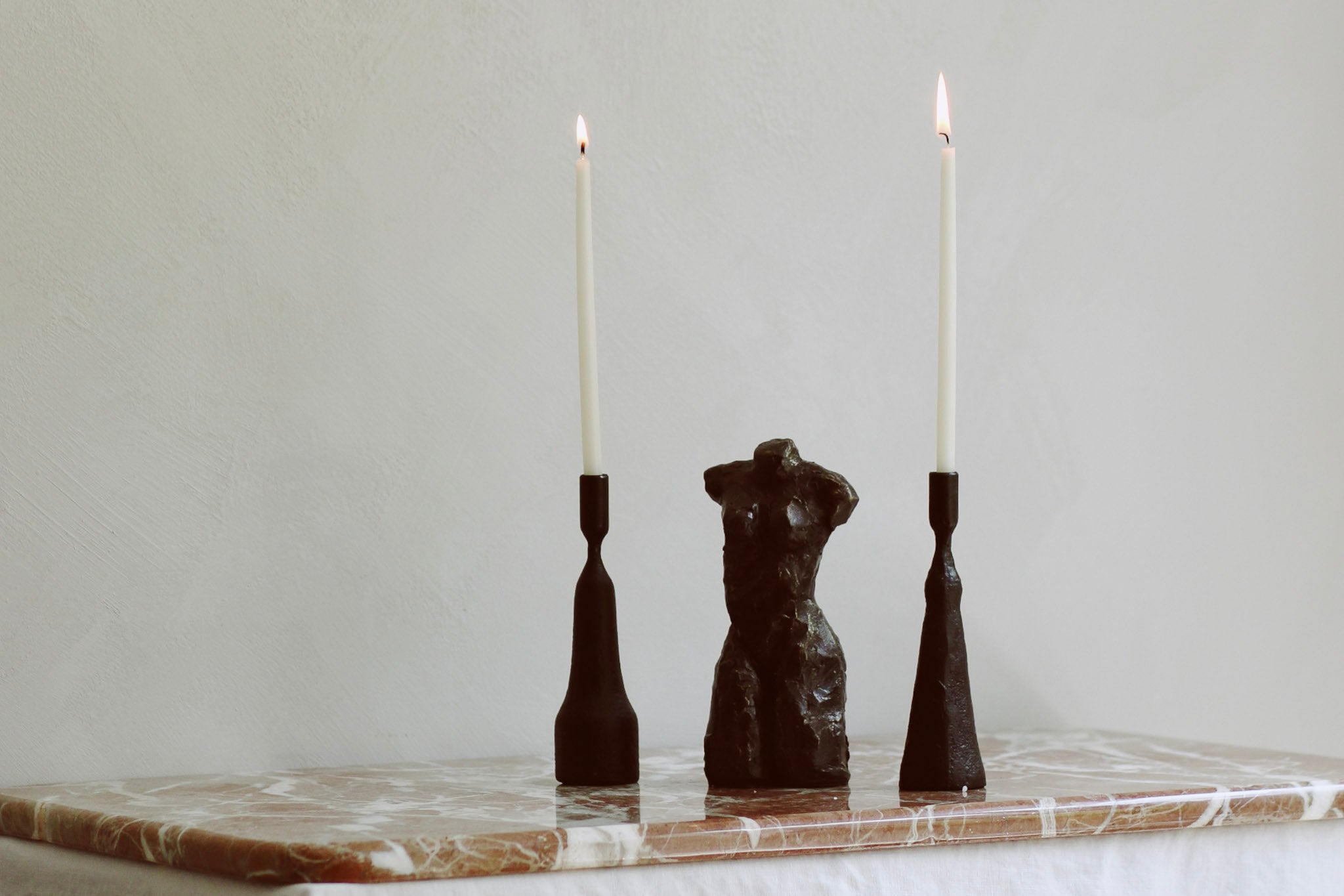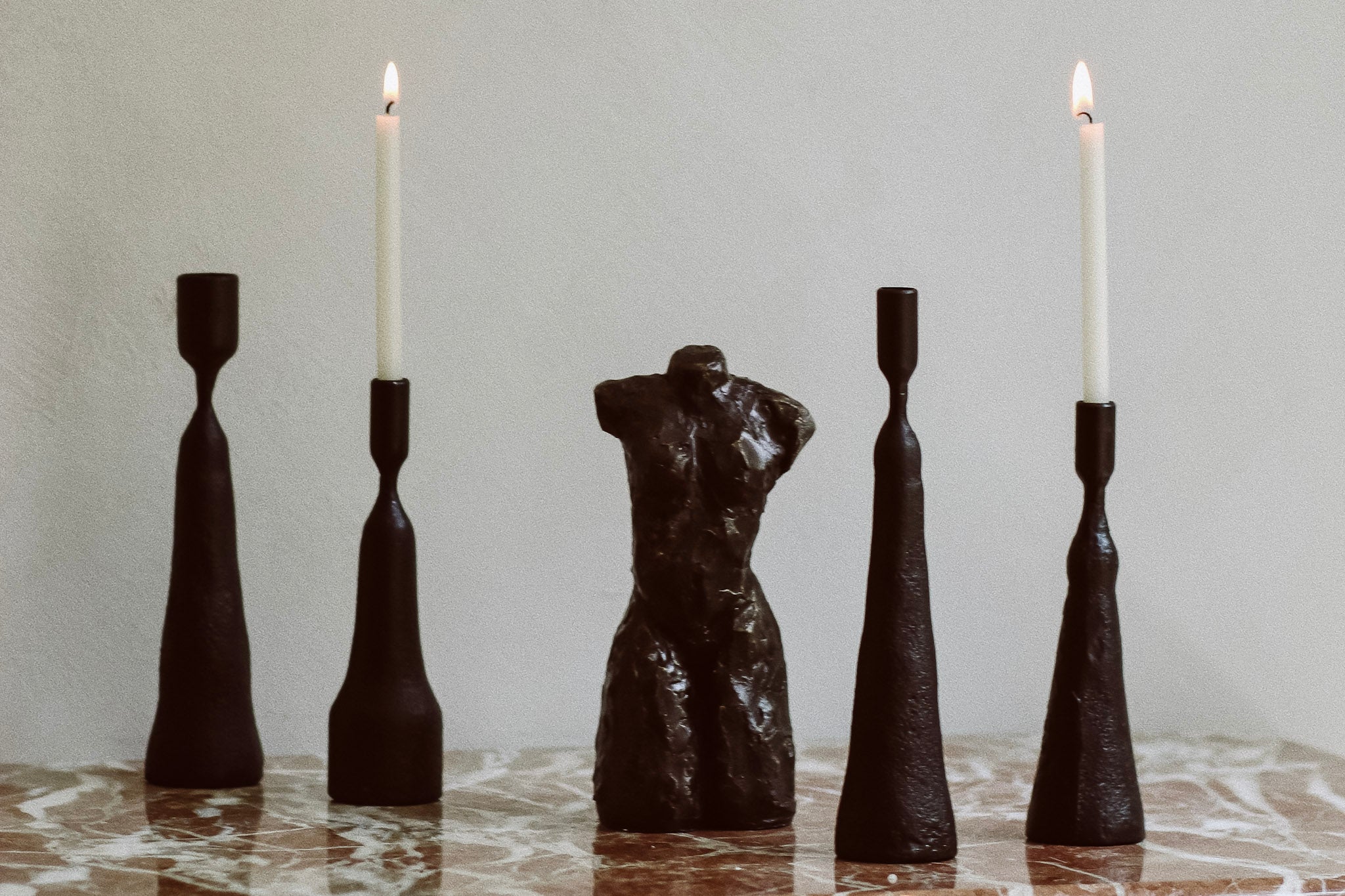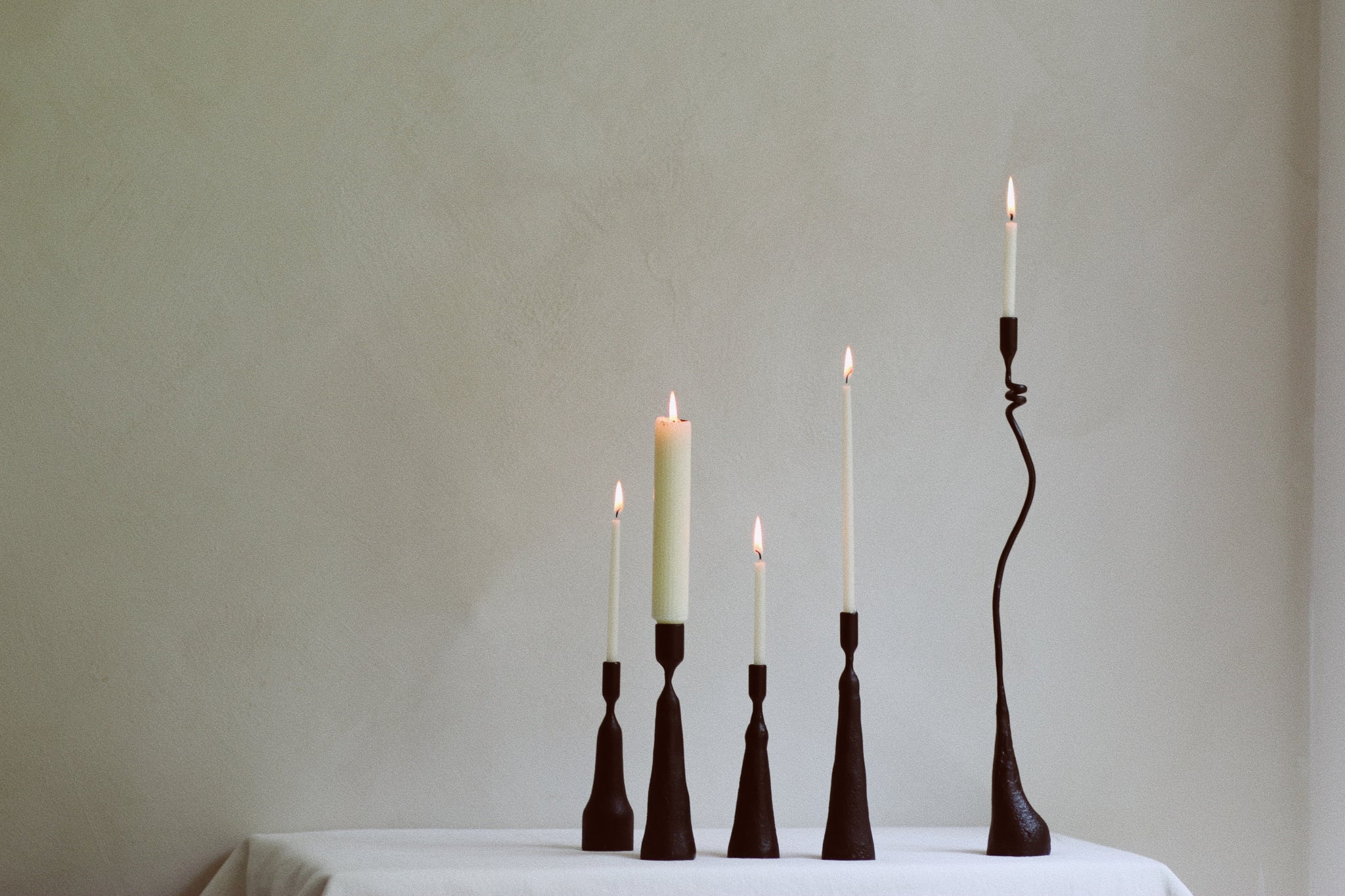Four iron candlesticks come together to form Flock, a quartet of light. Each member of Flock is an individual taper candle holder, with a different shape and weight, together they form a stunning collection of sturdy craftsmanship. Or, style them separately to dot your space with a little light.