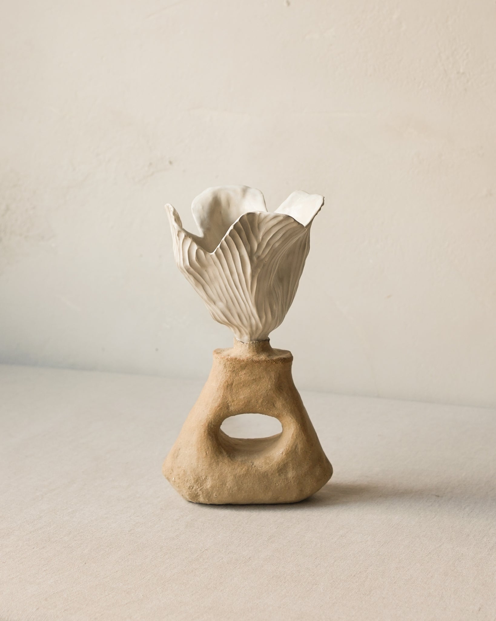 Ayala Braidman works under the name Lava Objects from her studio in Porto, Portugal, creating ceramic and papier-mâché sculptures inspired by desert landscapes. Her pieces draw names from geological phenomena, each referencing natural forces that shape landscapes over time.