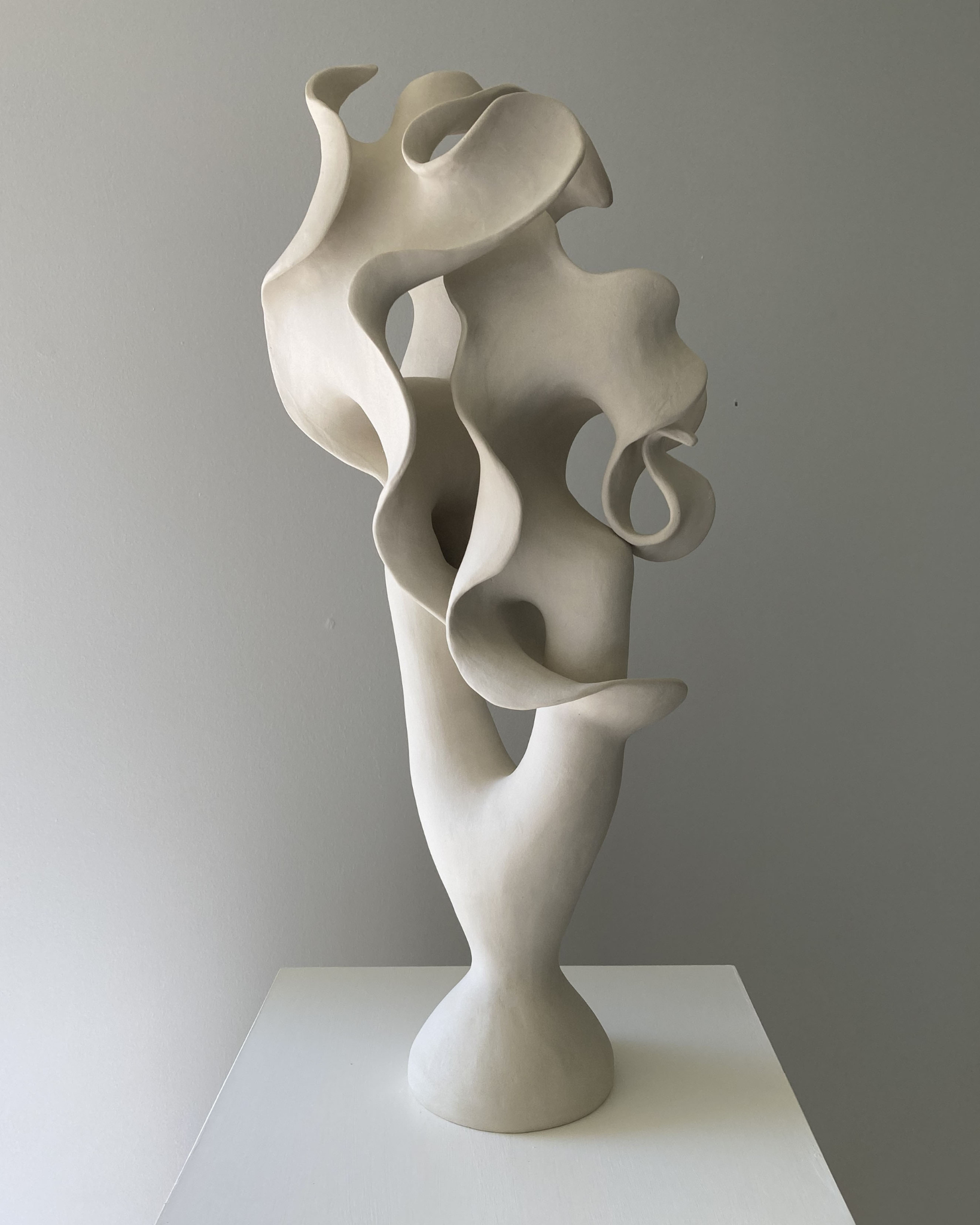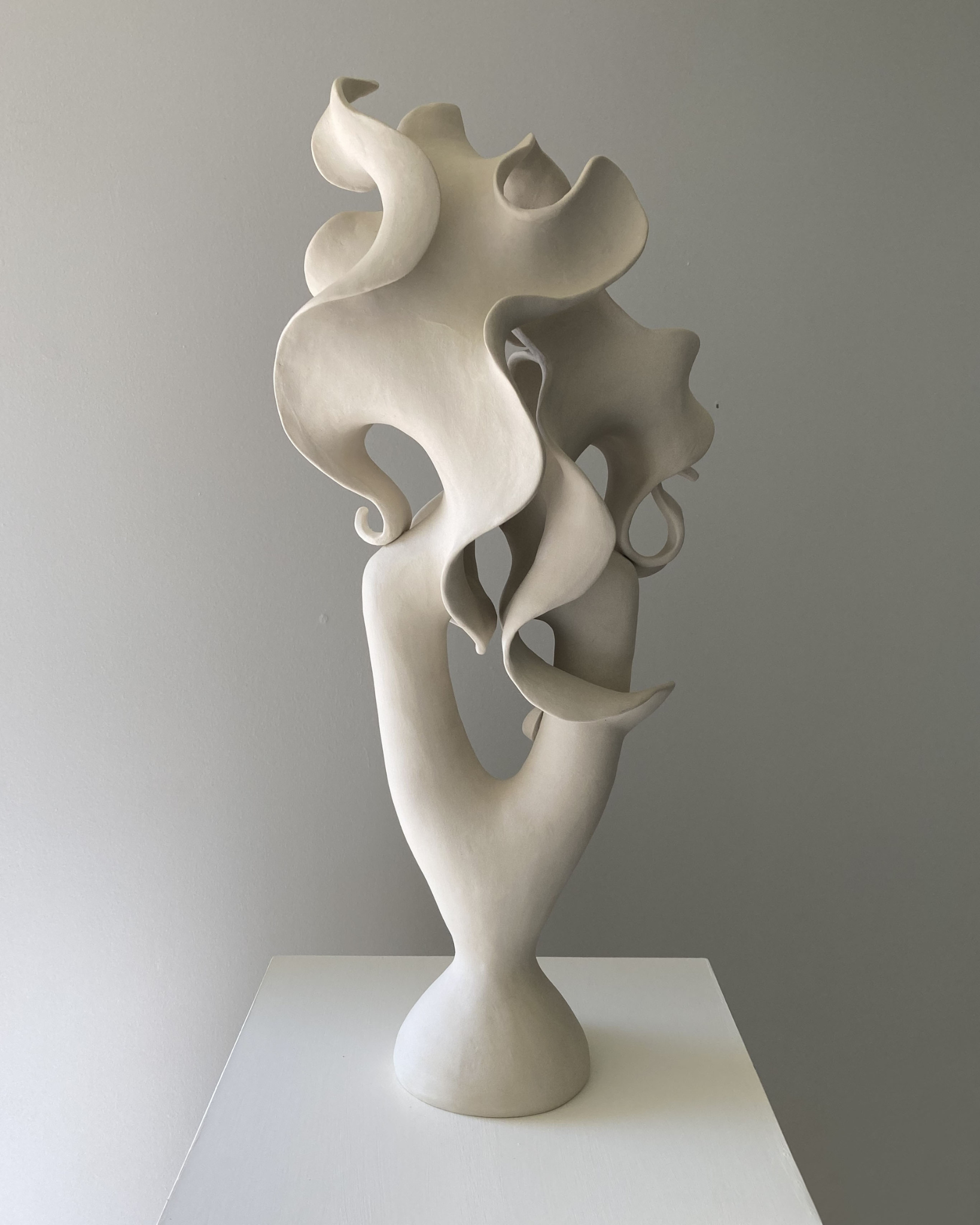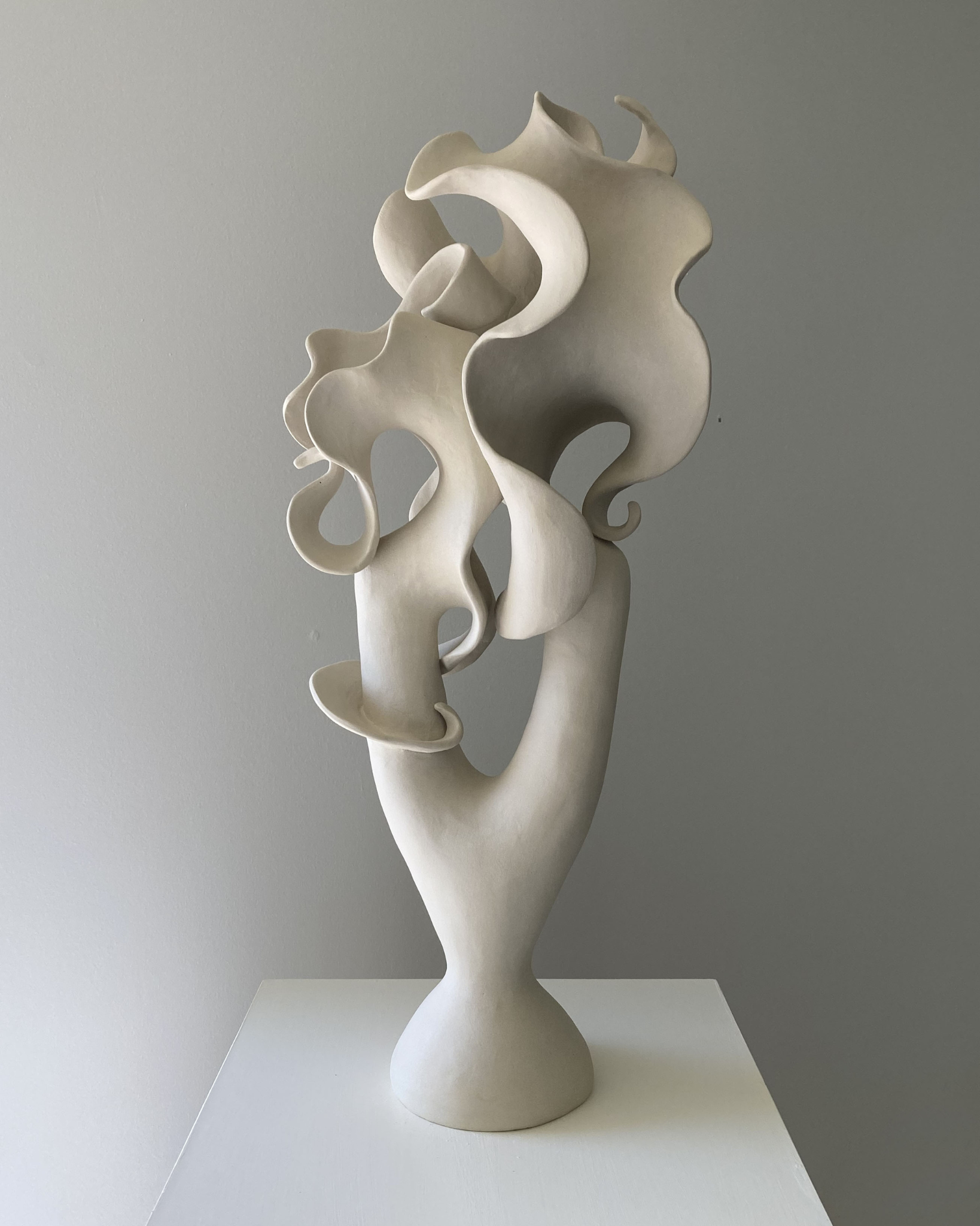 Smooth cream stoneware and a tall, graceful silhouette give this sculptural vessel a sense of quiet aspiration. The clean surface allows the organic form to speak on its own terms.