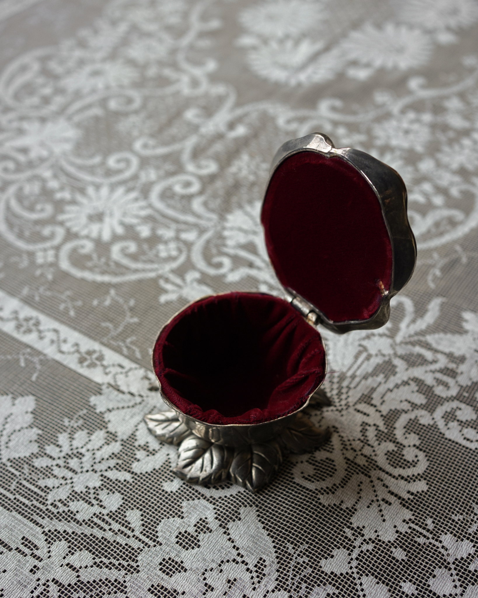Sculptural rose petals create the structure of this silver-plated jewelry box, where bloom and petal base unite in detailed metalwork. The velvet-lined interior and romantic design reflect refined decorative silver traditions.