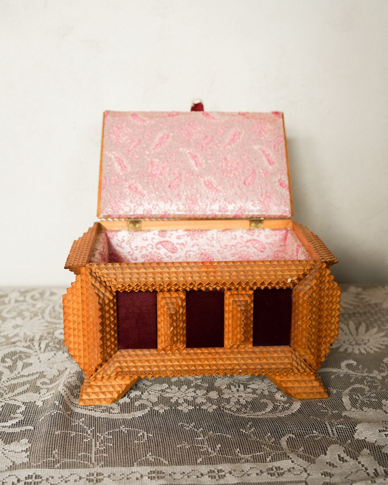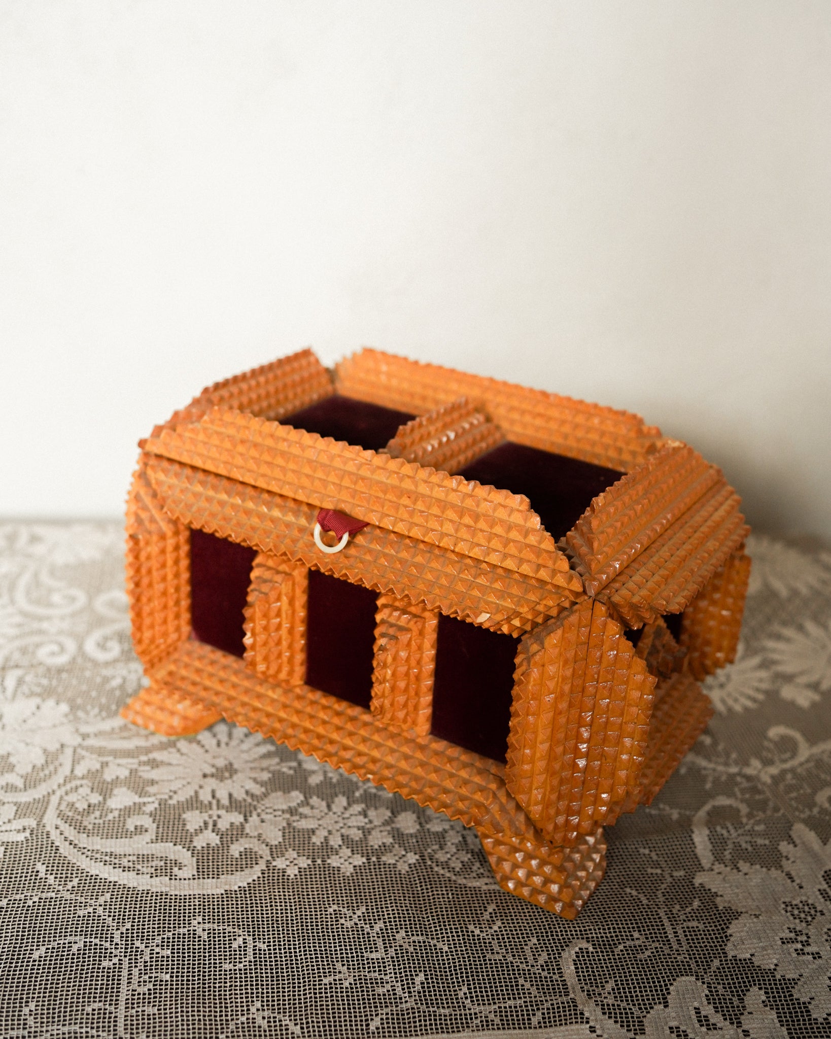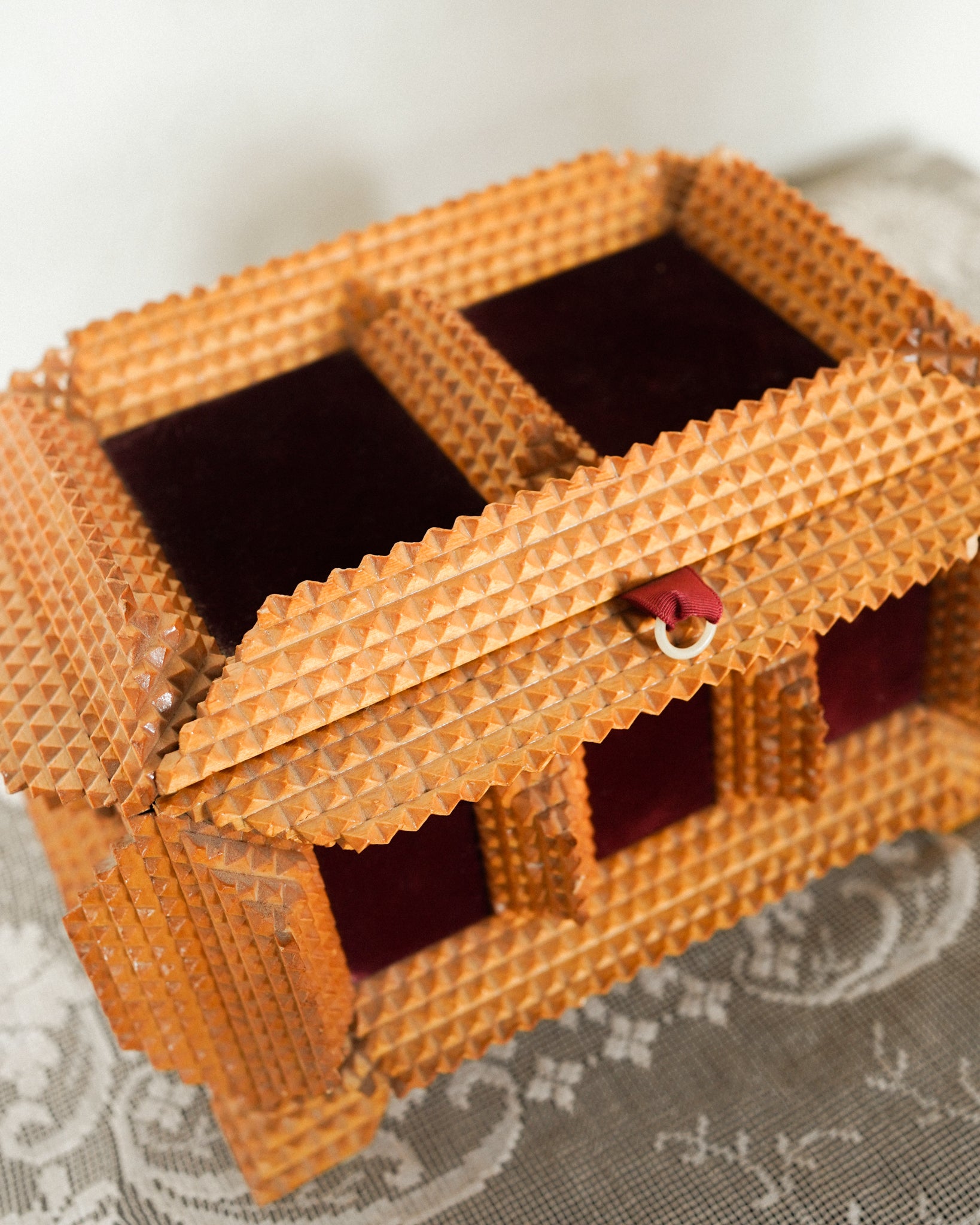 Layered chip-carved wood builds outward in a three-dimensional mosaic on this folk art trinket box, a tradition rooted in nineteenth-century craftsmanship. Red velvet panels accent the sides, softening the angular woodwork with a rich textile contrast. Use it to hold jewelry or small collected treasures on a nightstand or dressing table.