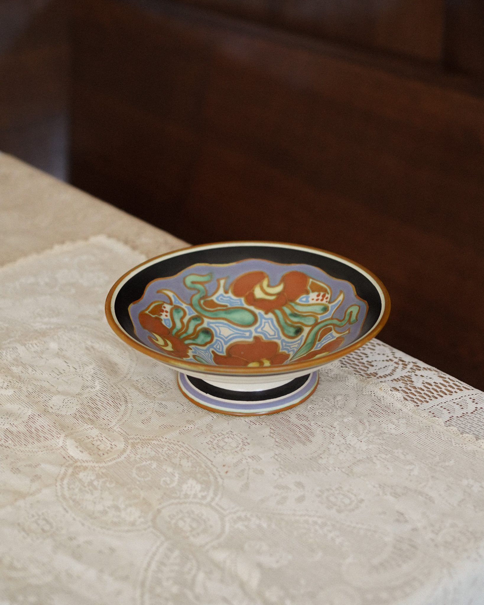 Rich glazing and hand-painted florals distinguish this footed bowl from the Gouda pottery tradition in the Netherlands. Art Deco influences show in the geometric patterning and vibrant color palette, signed by the artist. Beautiful for serving or displayed on a stack of books or dining room credenza.