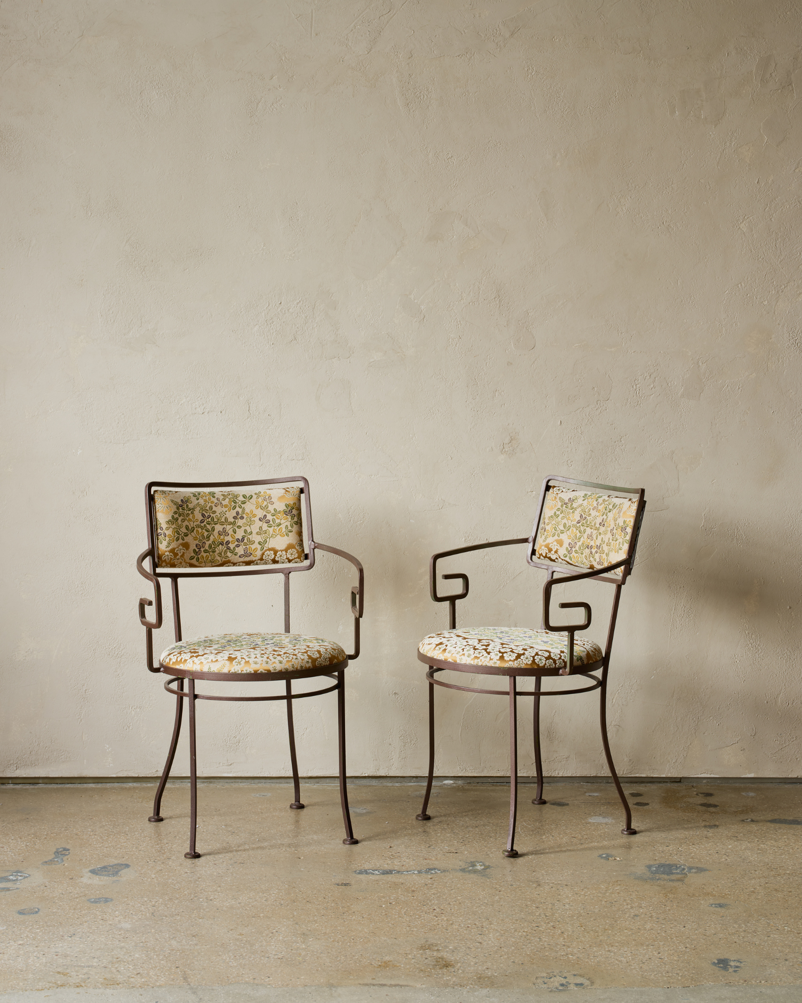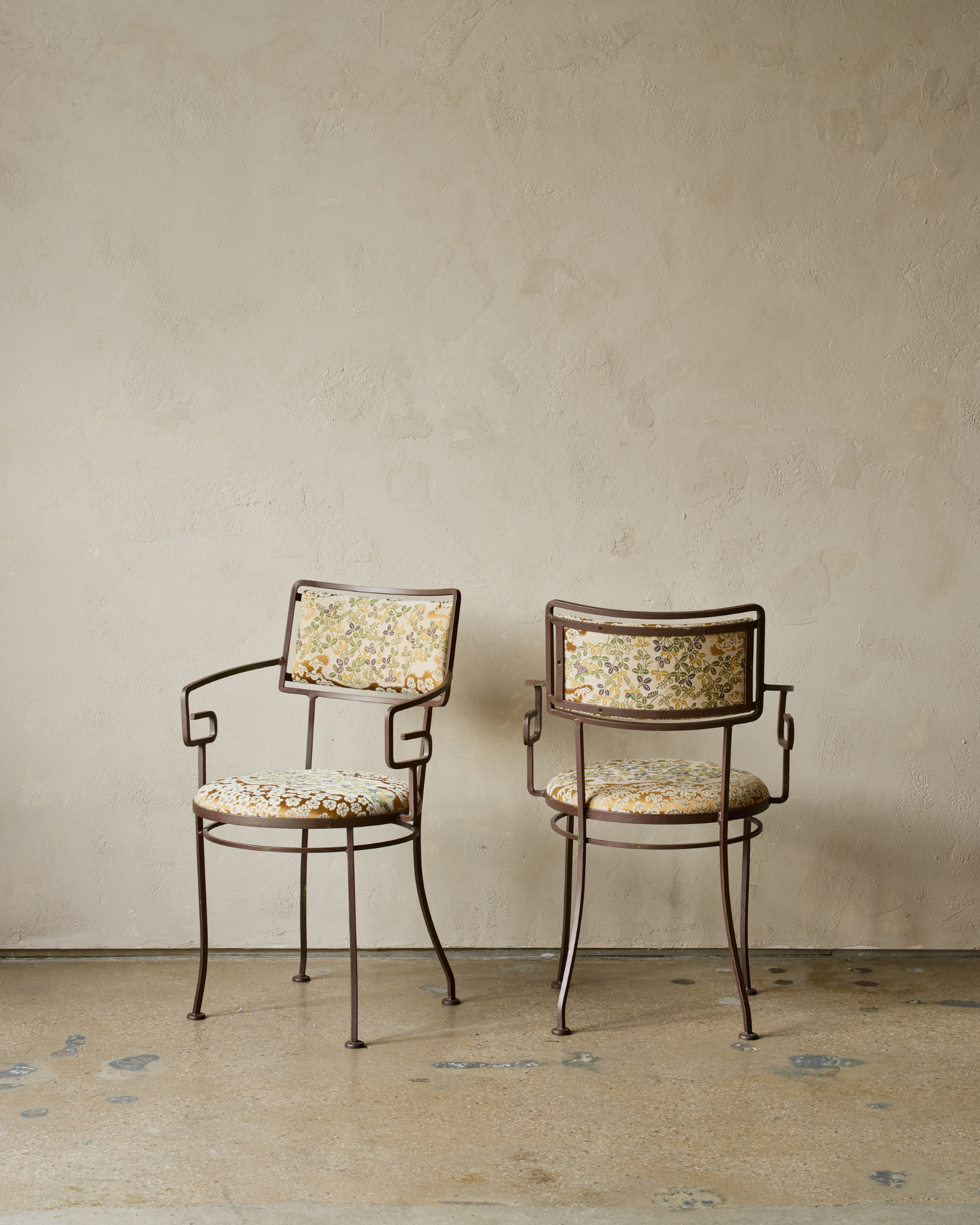 Bold metal frames create architectural presence in these armchairs, softened by botanical patterned upholstery. The mix of industrial structure and decorative textile makes them equally suited to dining tables or as statement accent seating.