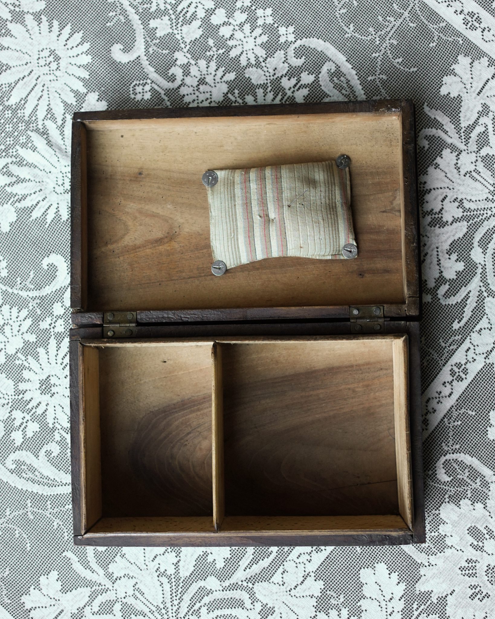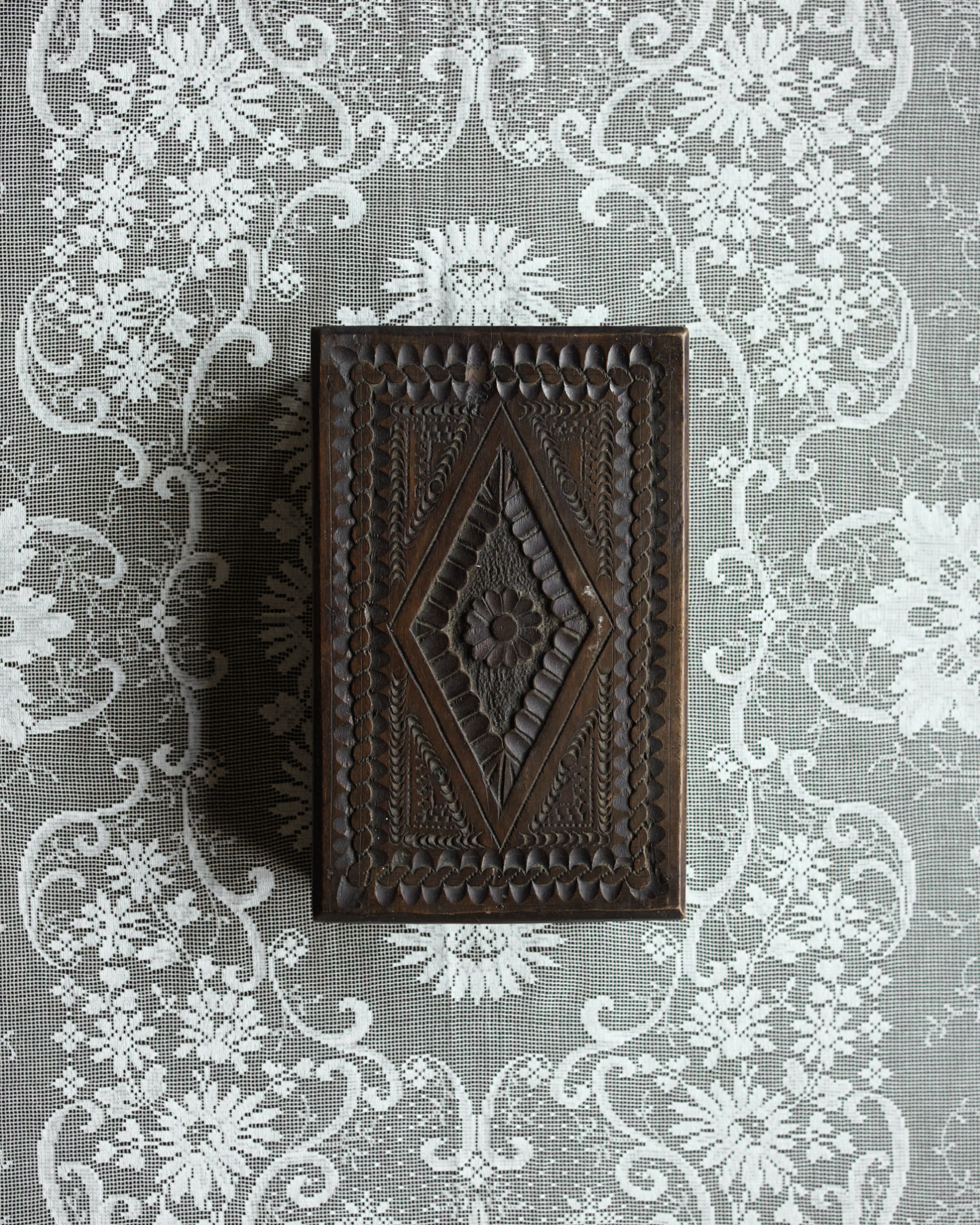 Intricate carved details cover this wooden sewing box. The substantial construction and ornate surface patterns reflect traditional woodworking techniques.