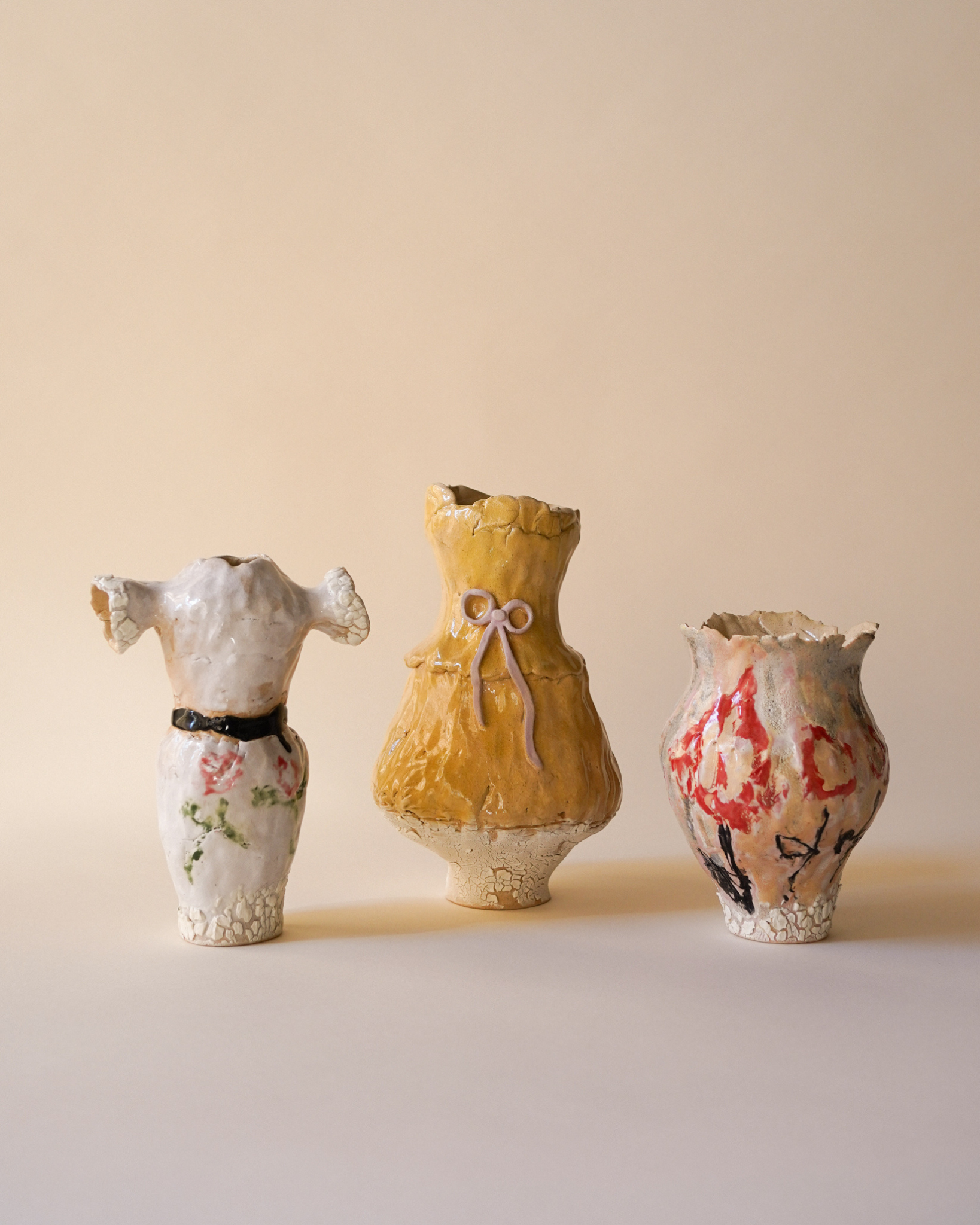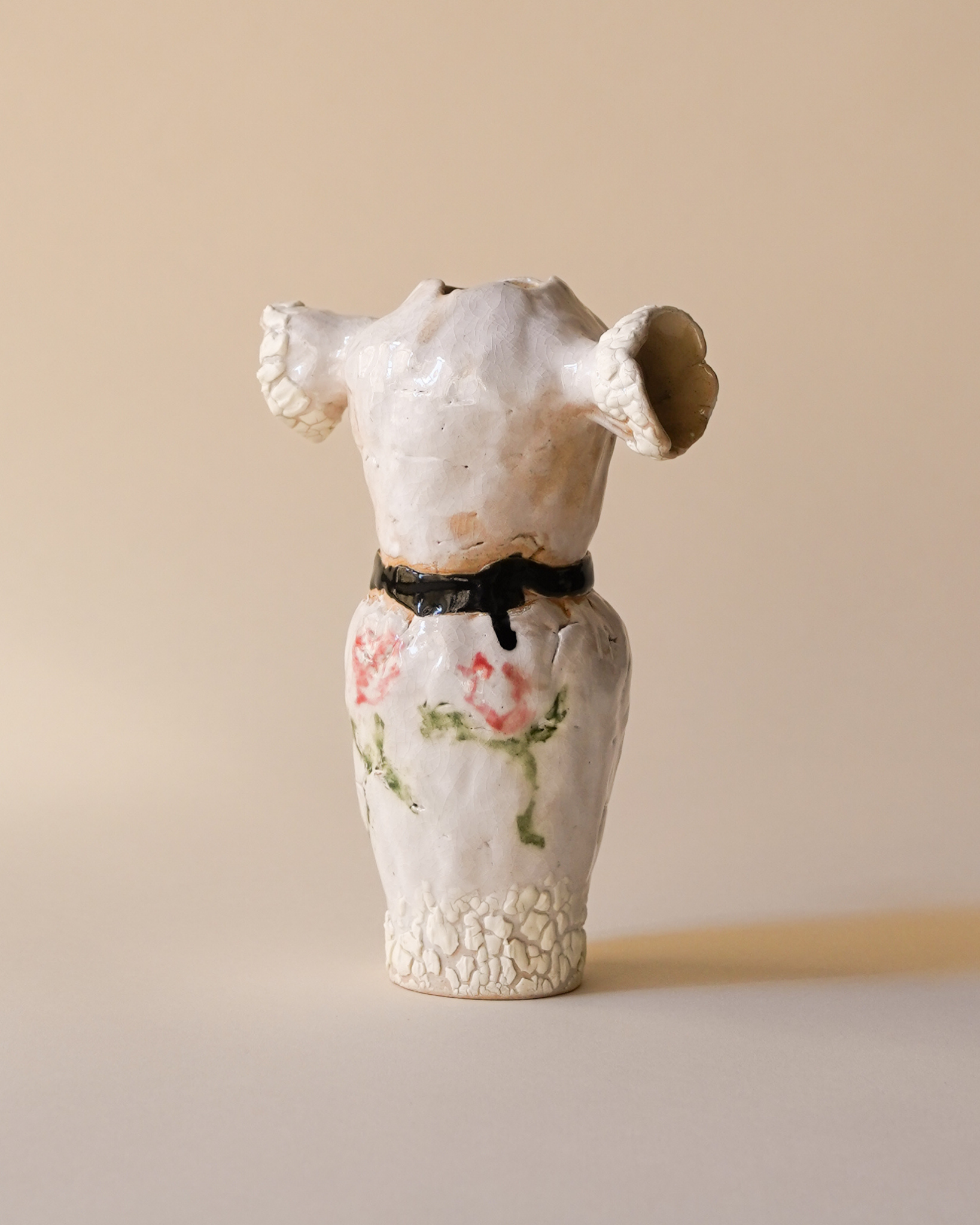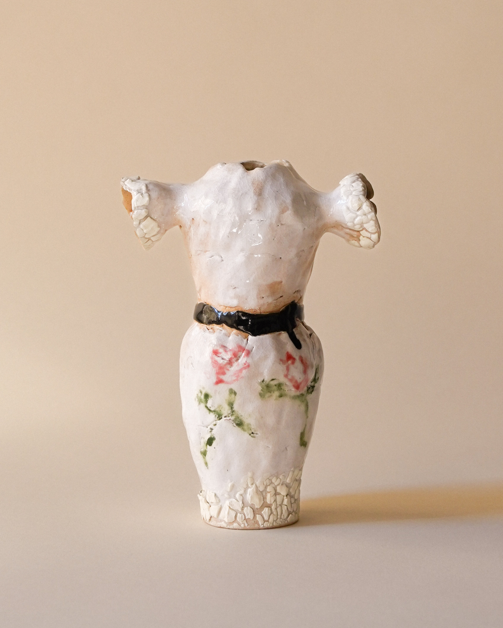 A figurative stoneware vessel shaped like a woman's torso, featuring painted floral details and a black belt at the waist. The piece is deliberately unfinished in its feel, rough at the edges and open at the top, arms reaching outward. Court spent much of the last year thinking about what it means to be a woman today. "Labels should be put to rest," she writes. This vessel is her response, powered purely by intuition.