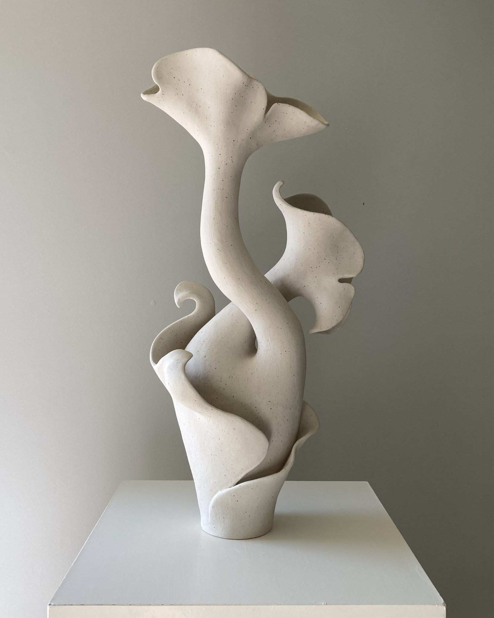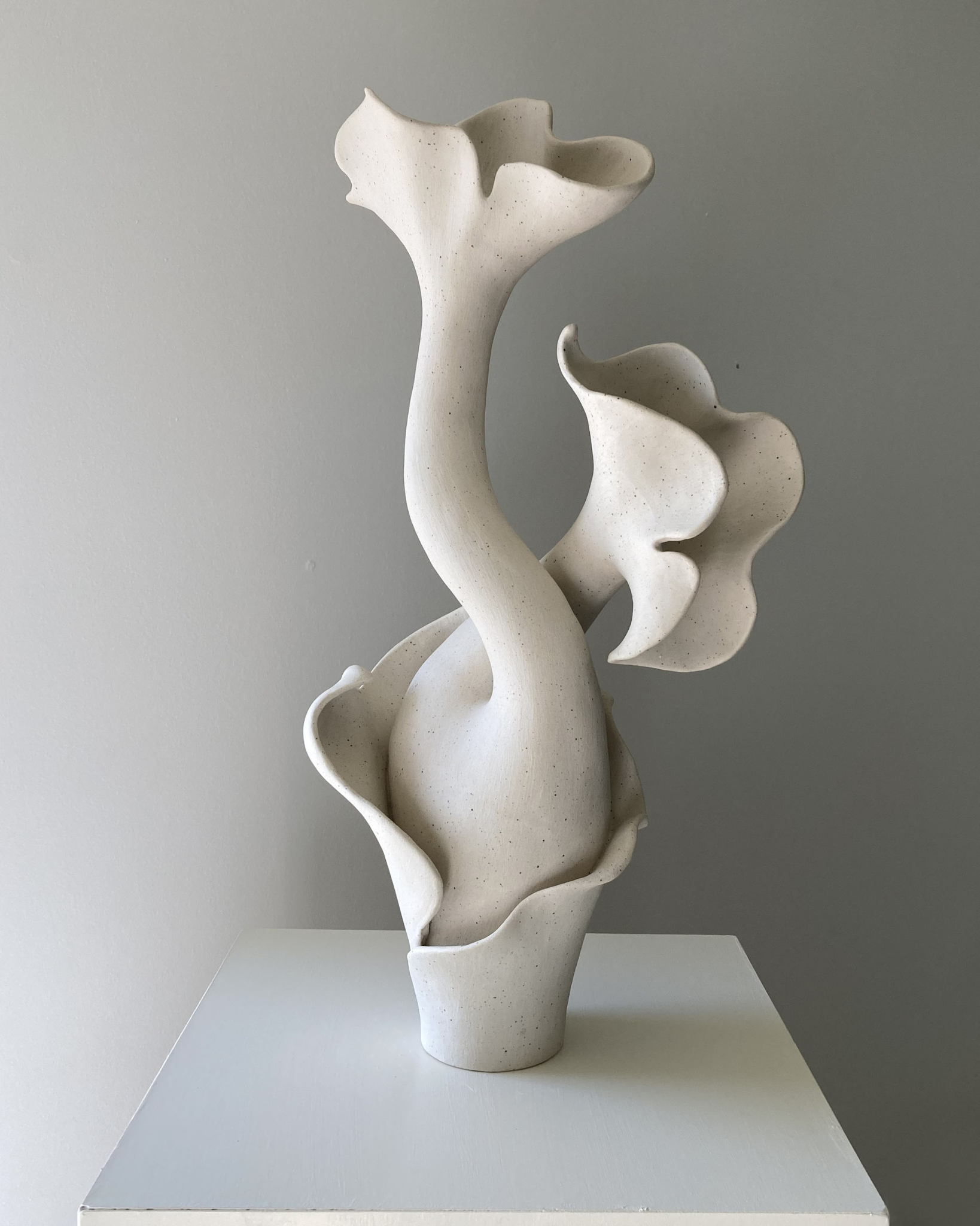 Smooth cream stoneware gives this sculptural vessel a quieter presence within Karen Quirion's collection, where form takes center stage. The tall, narrow silhouette evokes the upward reach of a stem or petal unfurling.