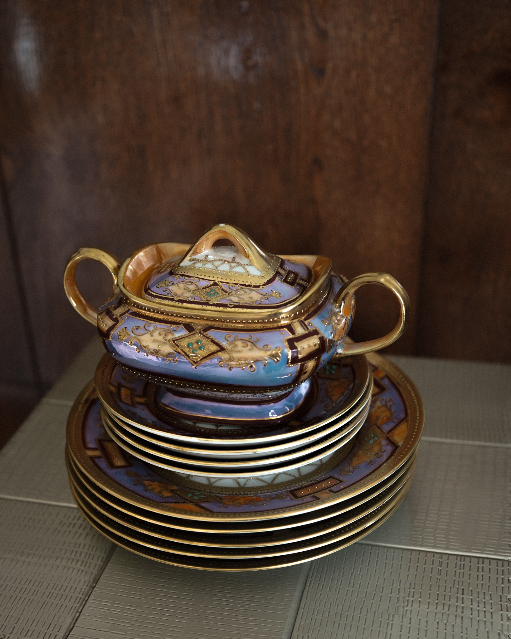 Gilt detailing and raised enamel patterns decorate this Japanese eggshell porcelain tea with five settings. The ultra-lightweight porcelain has a delicate translucency, with hand-painted gold leaf and soft blue ground across teapot, creamer, sugar bowl, cups, saucers, and plates. A beautiful set for afternoon tea or displayed together on a sideboard or hutch.