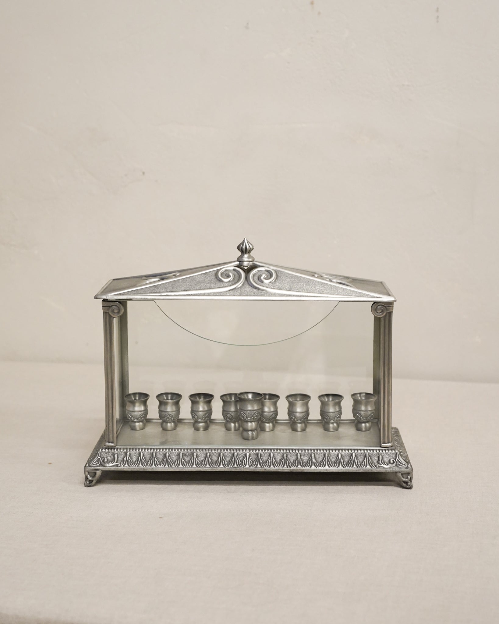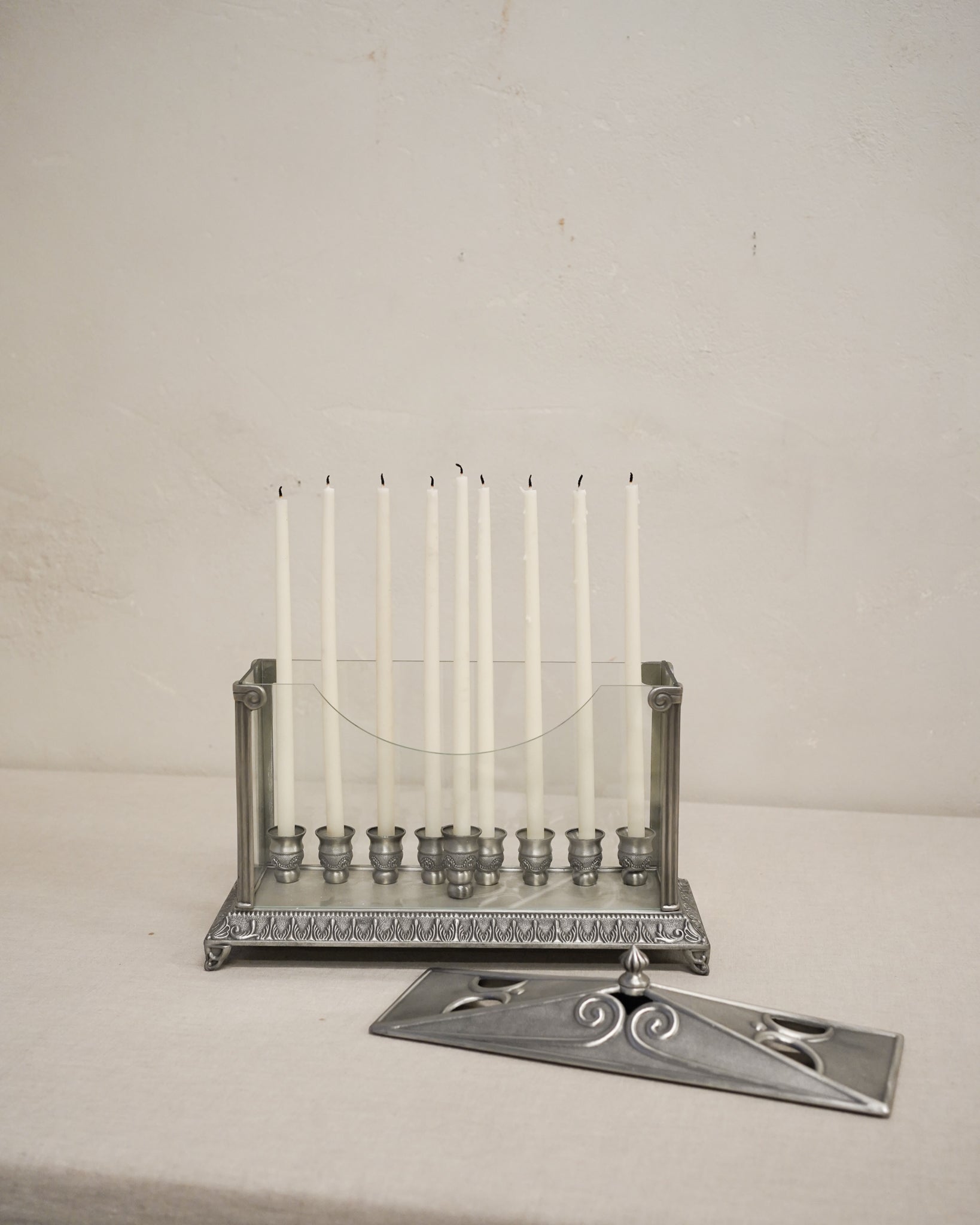 Designed as an elegant glass display case, this metal menorah represents a unique approach to Judaica presentation. The plush-lined protective case with curved glass front allows viewing while keeping the piece protected. Nine candle holders rise from the metal base, creating presence whether displayed within its case or brought out for use.