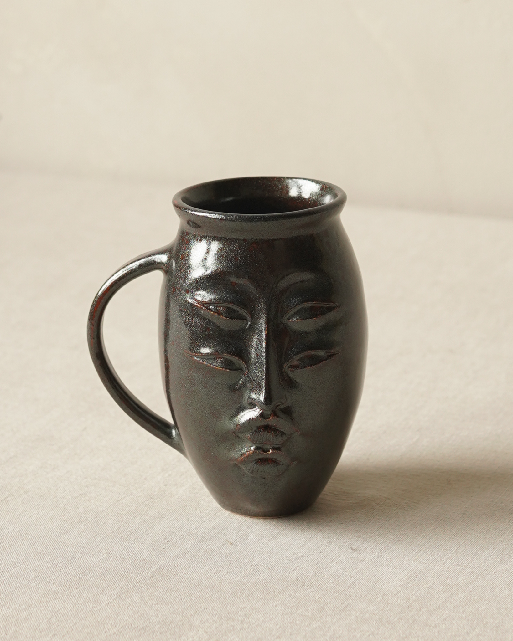 Glossy black stoneware glazed inside and out with a sparkle teadust finish that shimmers when it catches light. The hand-sculpted face has presence—equal parts sculpture and morning ritual.
