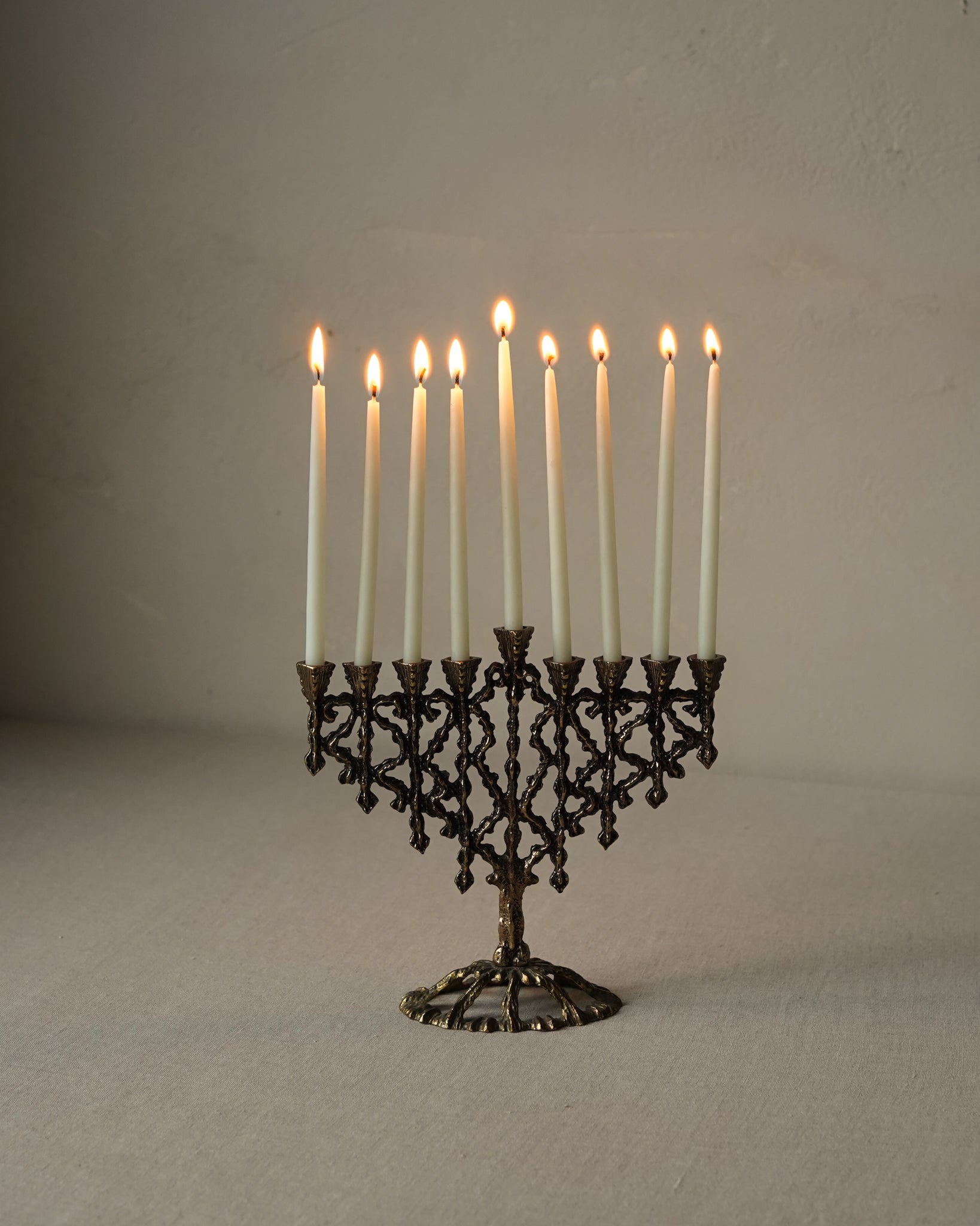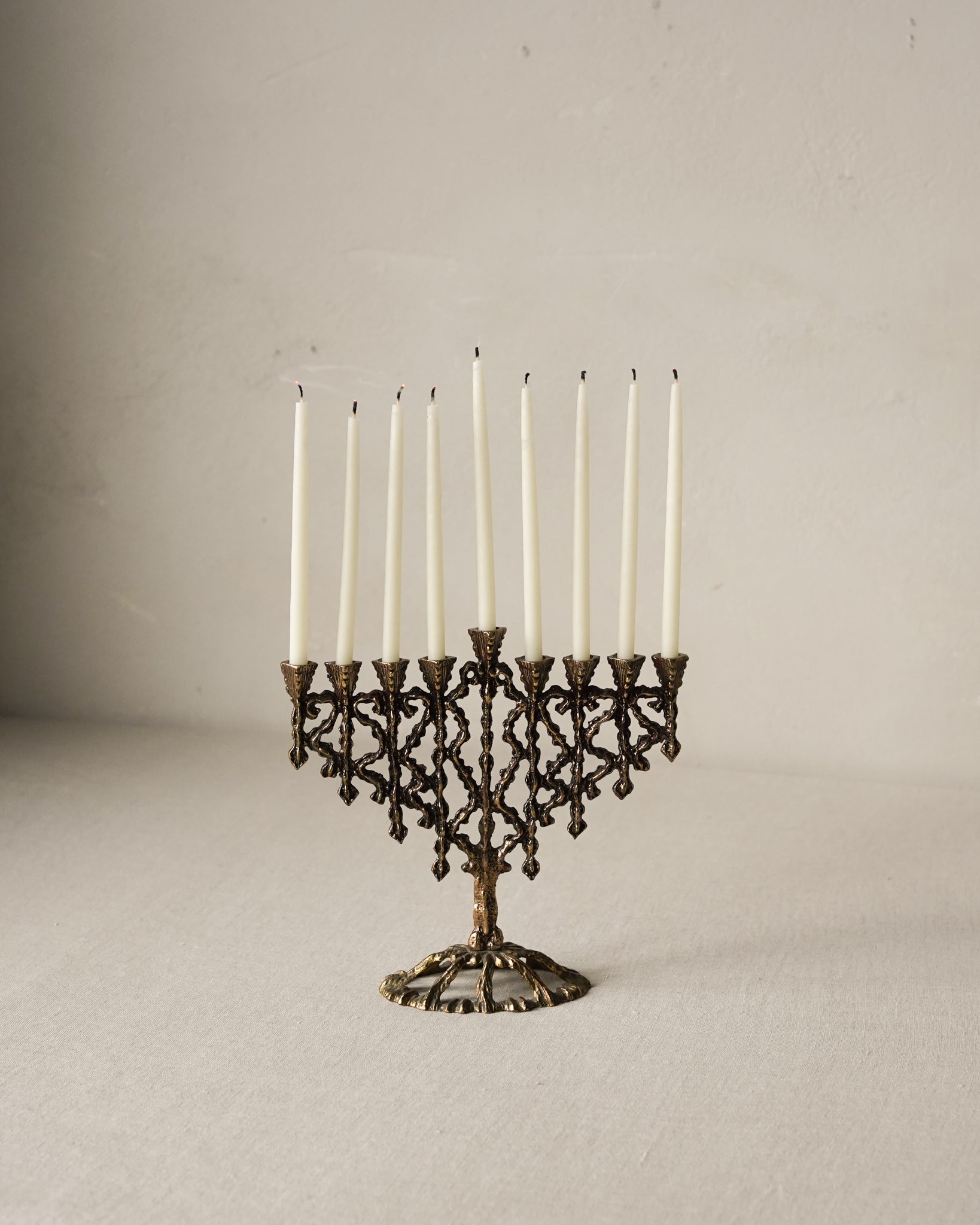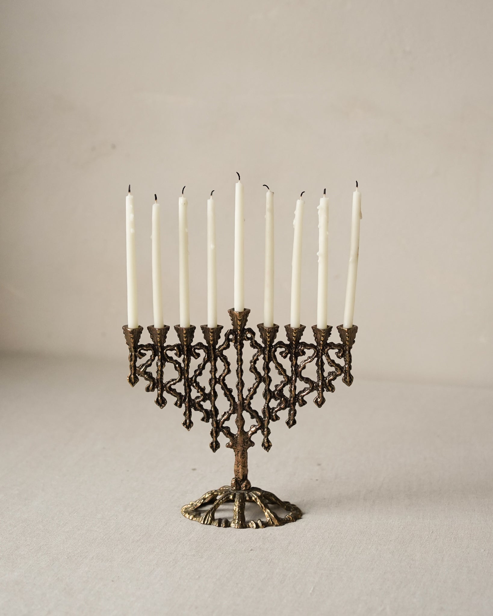 Bold geometric forms define this Brutalist menorah, where raw metalwork creates dramatic presence. The square proportions and angular construction reflect the movement's celebration of honest materials and sculptural mass. Nine candle holders emerge from the geometric base with stark simplicity.