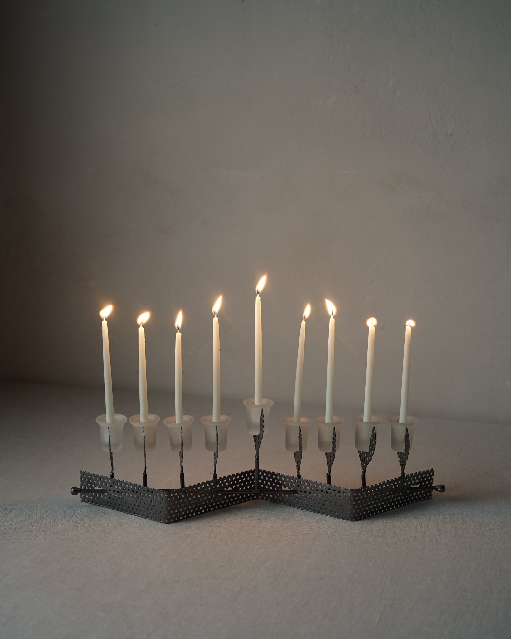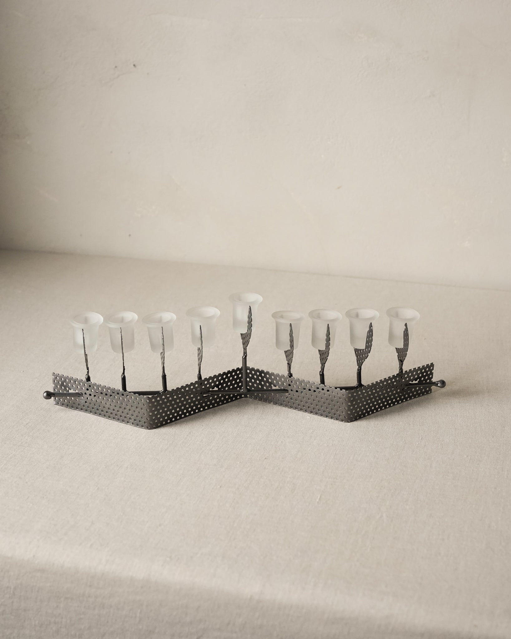 Clear glass cups nestle within metal framework in this substantial vintage menorah. The combination allows for both traditional candle lighting and oil lamp use, offering versatility in celebration. The elongated form creates dramatic horizontal presence.