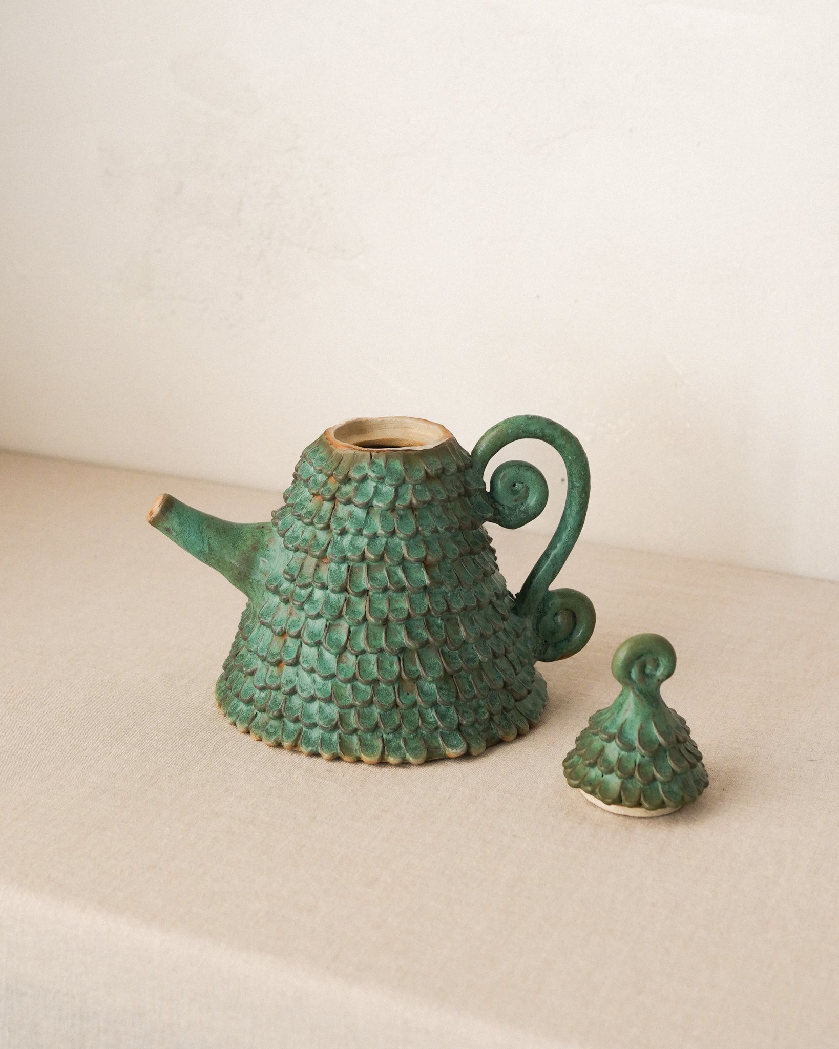 This whimsical ceramic sculpture from Bella Tylen's Peculiar Patina collection takes the form of a teapot, transforming a familiar object into artistic expression. Featuring Tylen's signature spiral details and wonky proportions, this piece grew from experimentation at her dining room table, where textured surfaces and off-kilter forms came together in unexpected harmony.