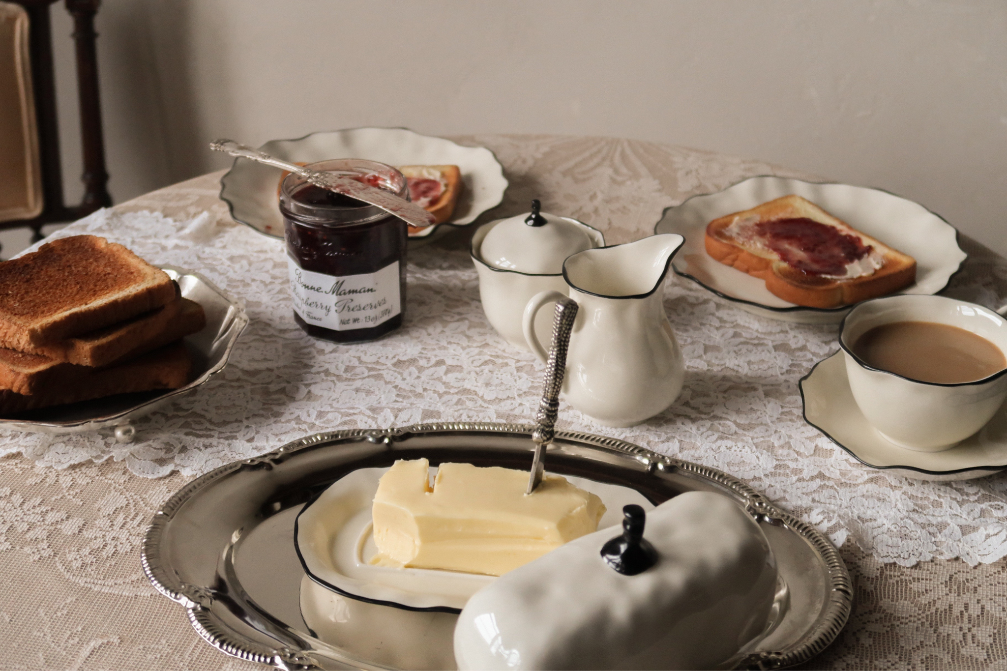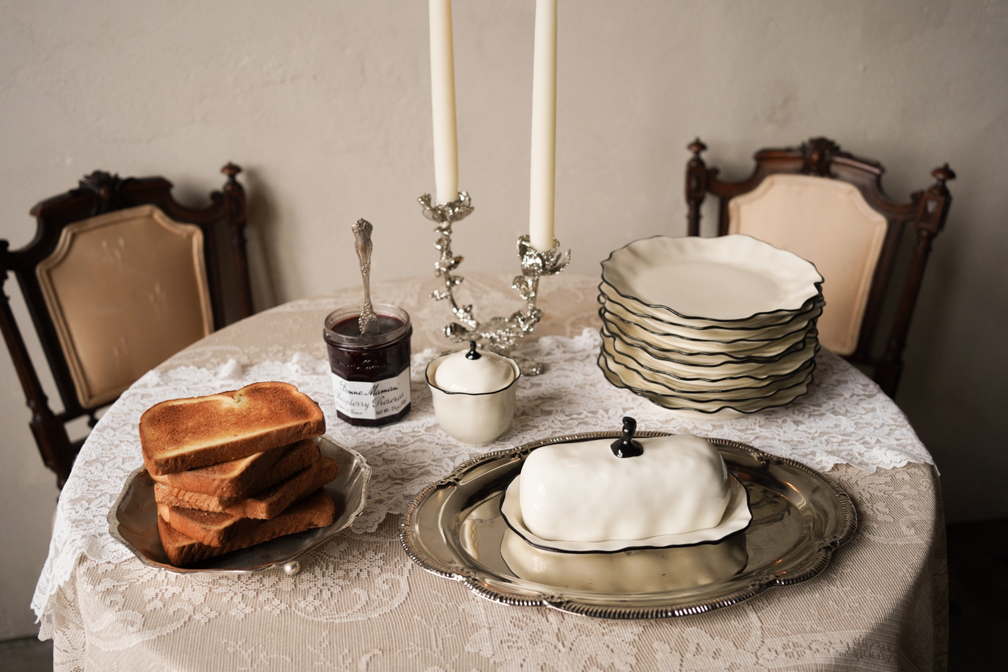 The Ribbon Butter Dish carries the classic Ribbon Collection details: a soft, cream-colored porcelain base and a hand-painted black edge that is just slightly wonky—a whimsical addition to the collection.
