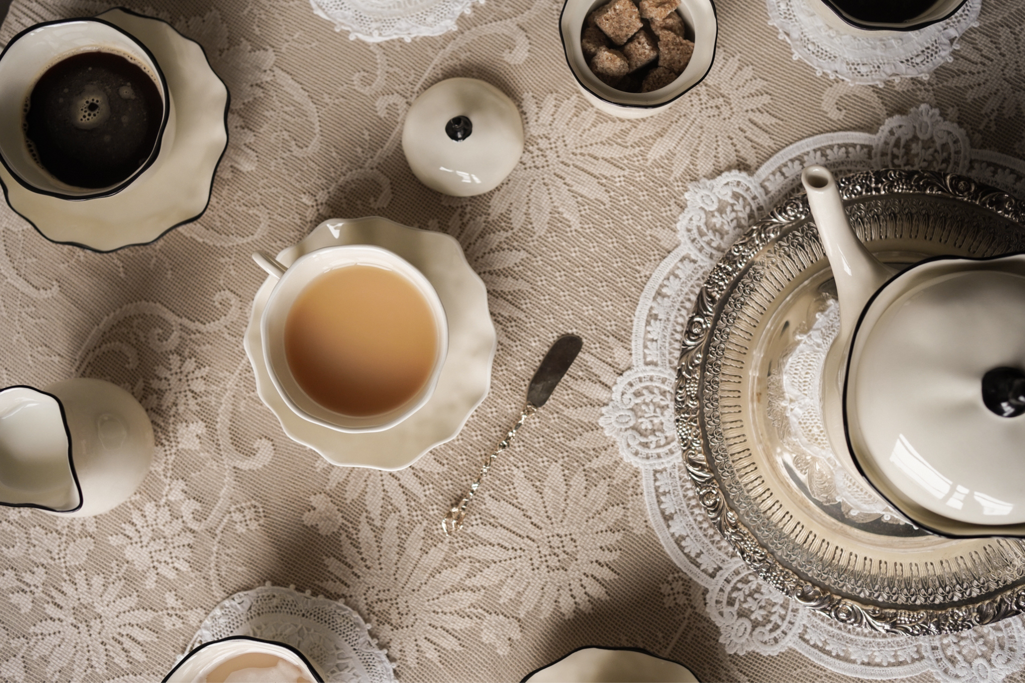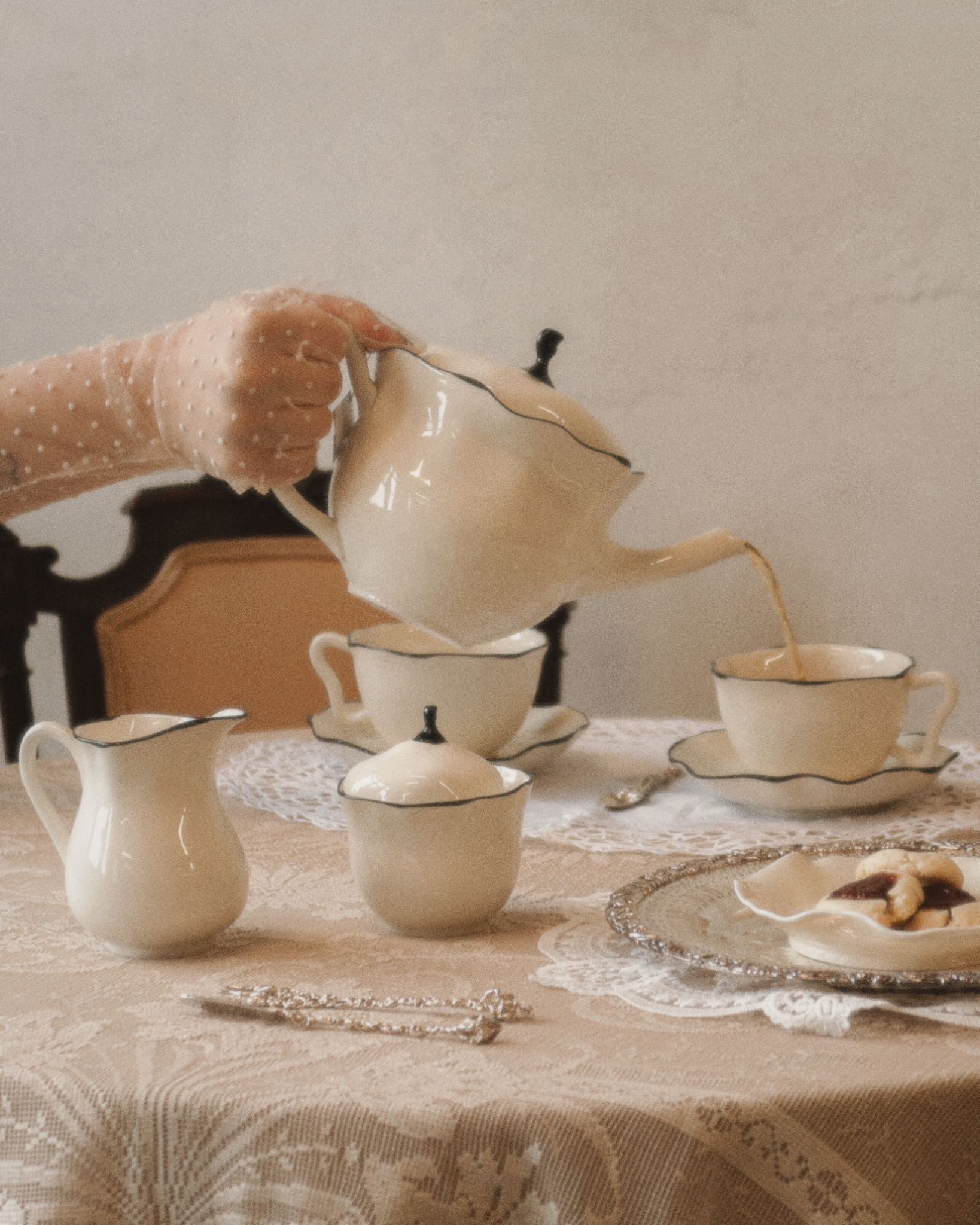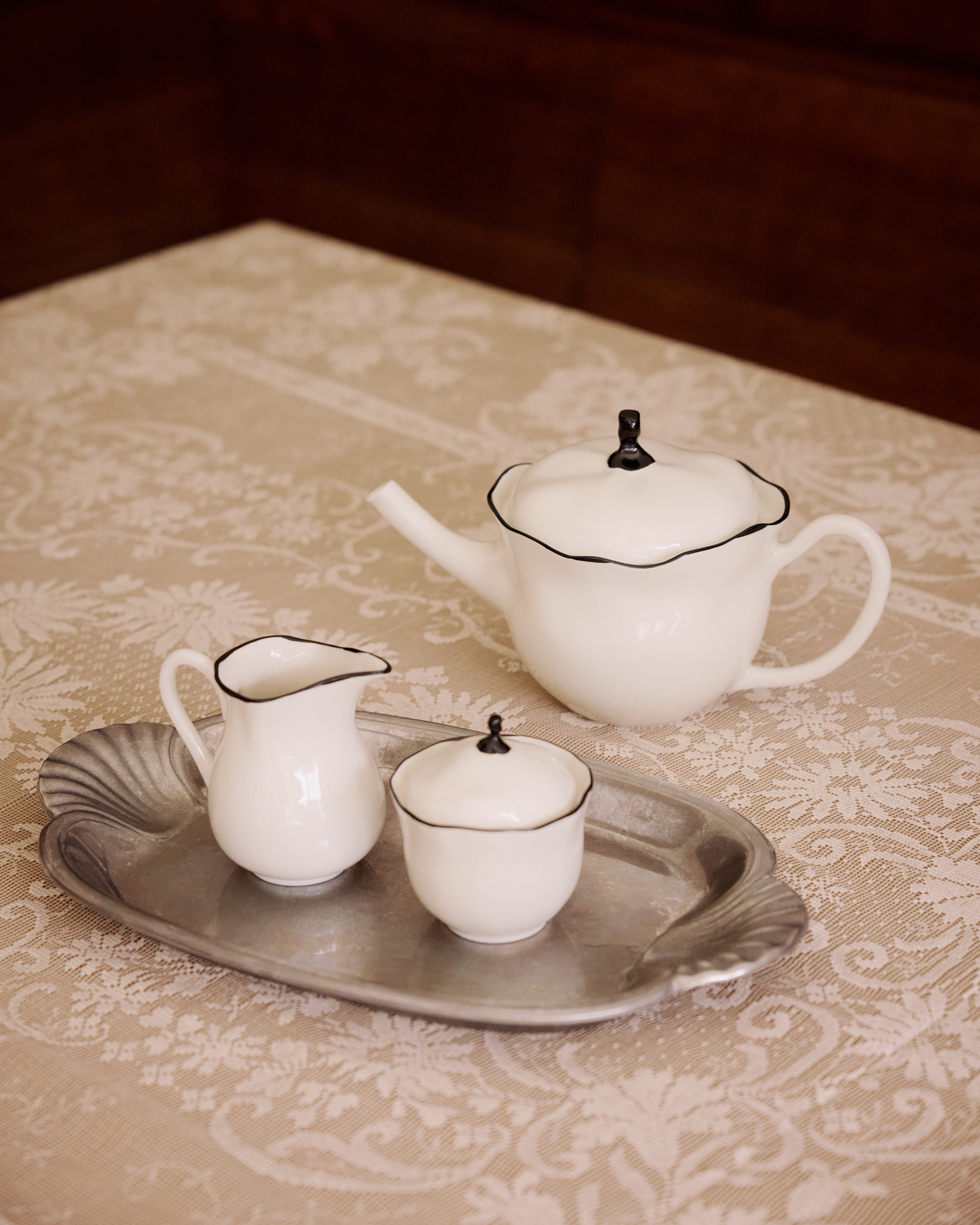 The Ribbon Teapot carries the classic Ribbon Collection details: a soft, cream-colored porcelain base and a hand-painted black edge that is just slightly wonky—a whimsical addition to the collection.