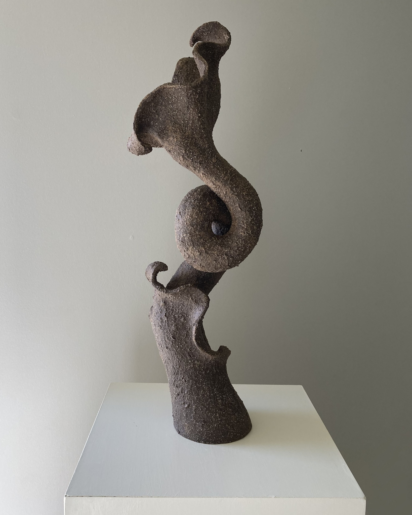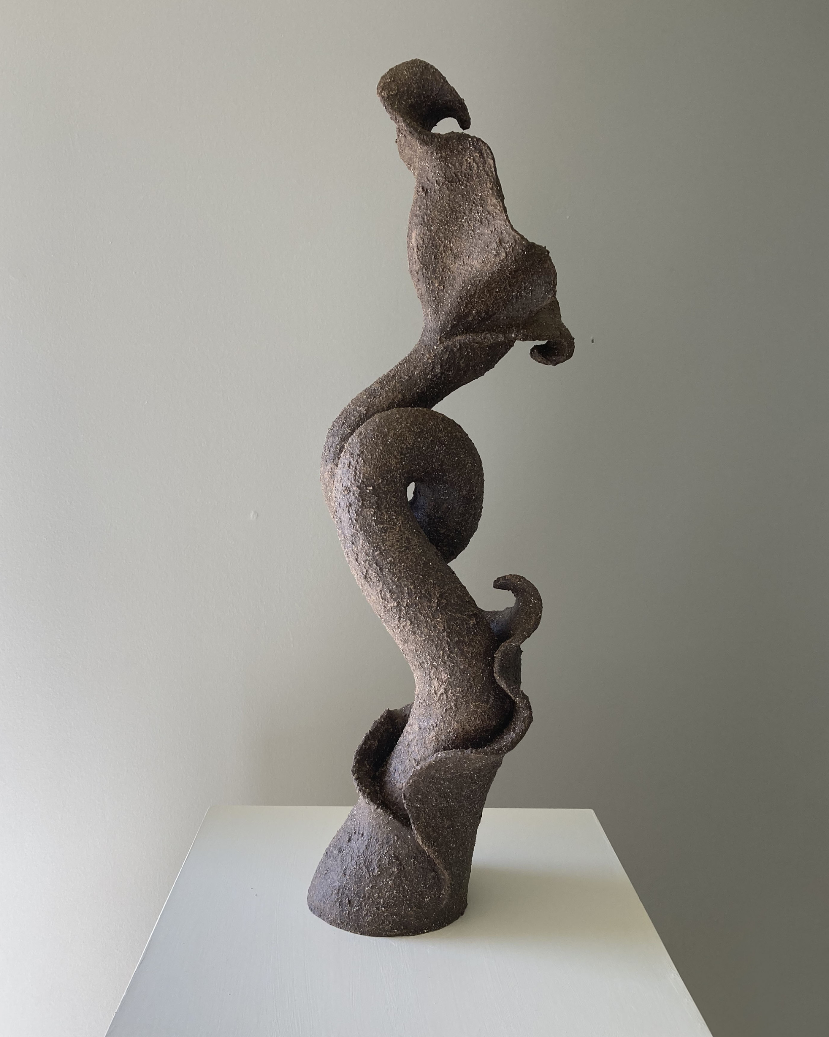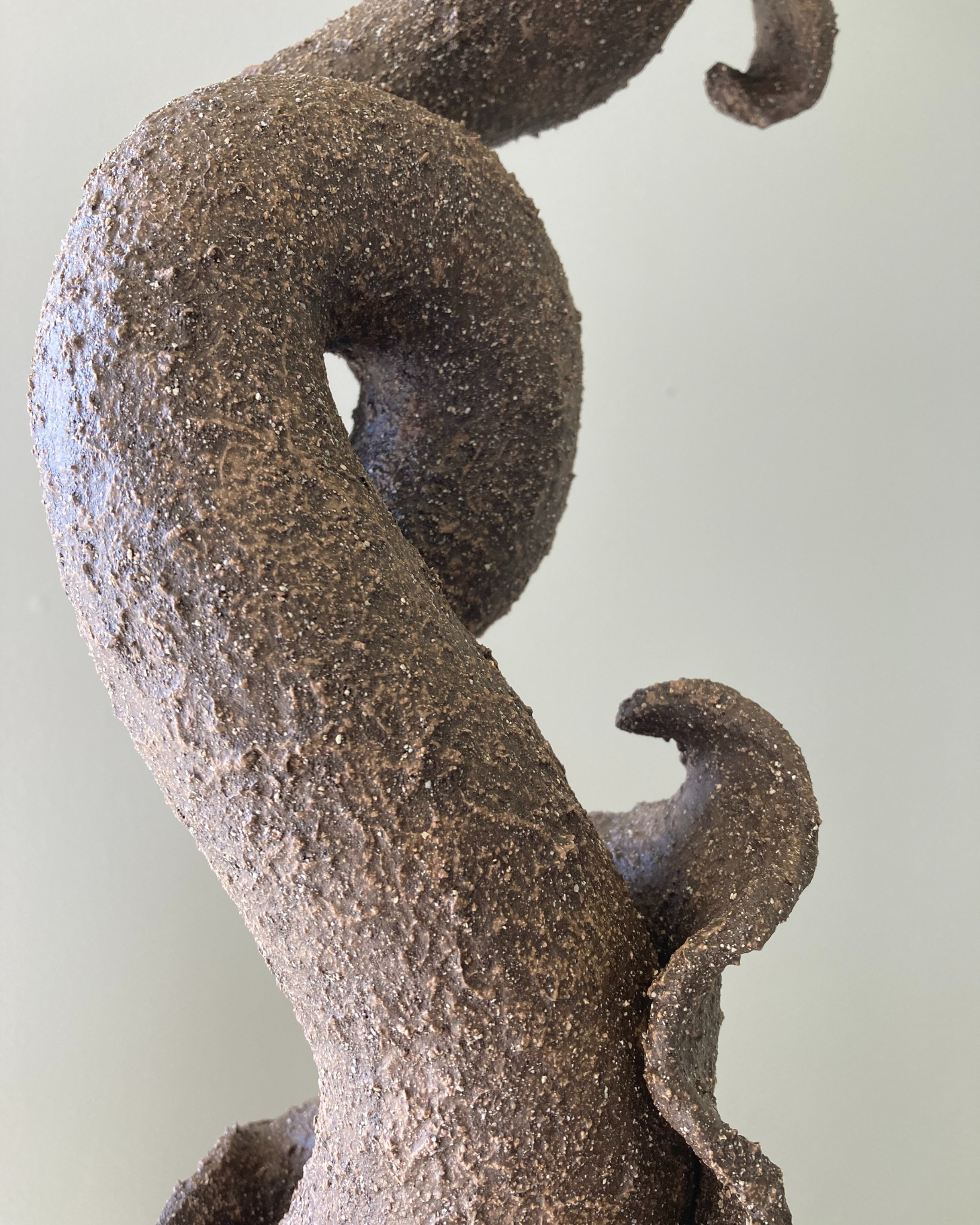 Brown stoneware and a heavily textured surface give this sculptural vessel dramatic presence. Named for the protective outer parts of a flower, Sepals captures that threshold moment between bud and bloom.