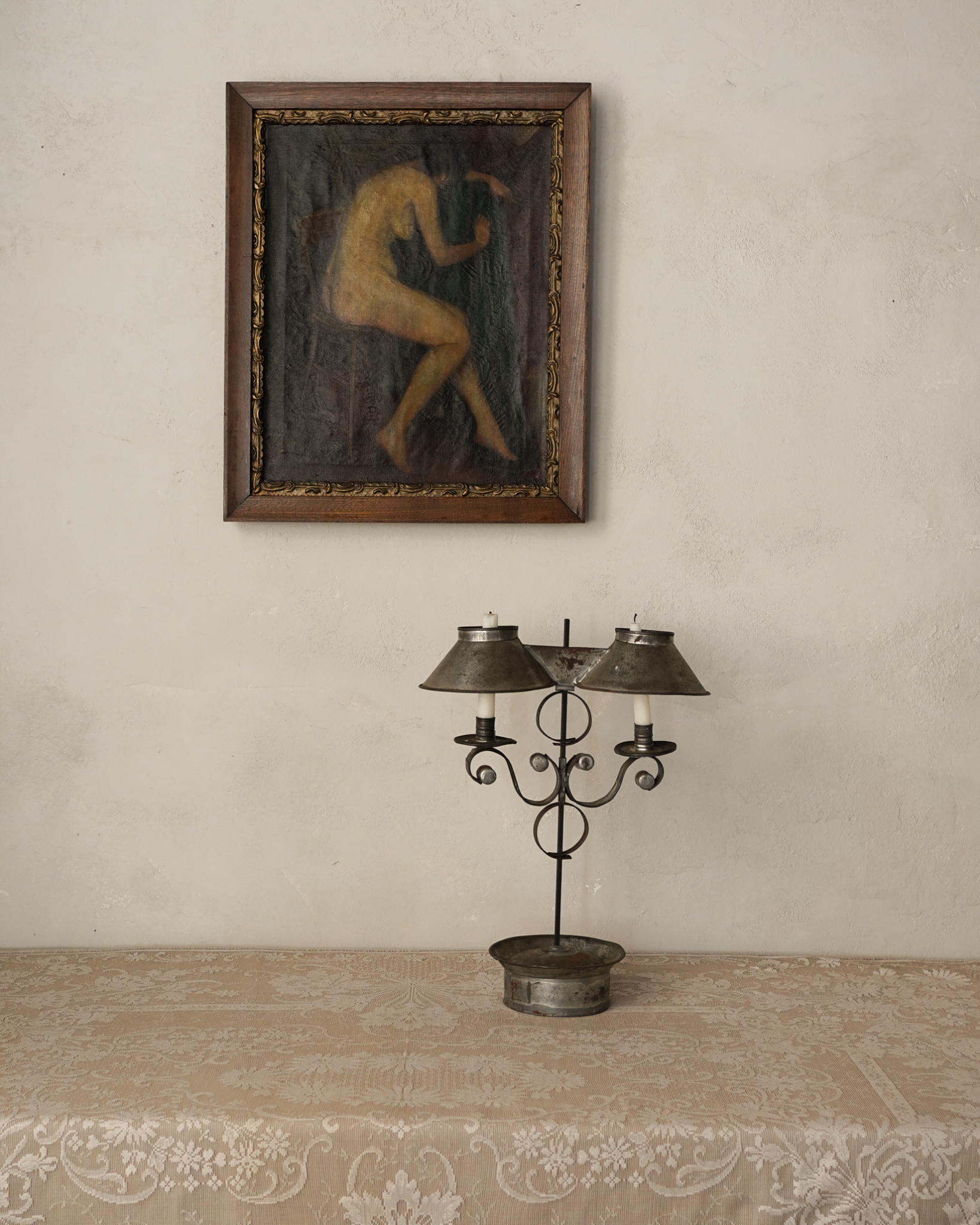 A sensual seated figure anchors this painting. The worn wooden frame adds authenticity to period portraiture.