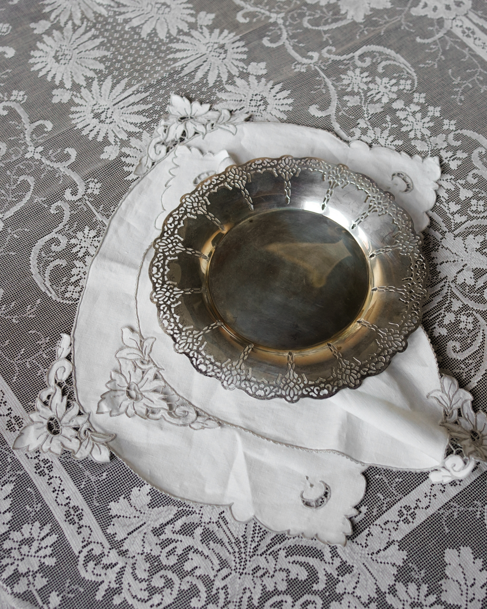 Delicate lace patterns circle this silver-plated dish, where ornate cutwork creates elegant visual depth. The traditional piercing technique showcases skilled metalwork characteristic of fine serving pieces.