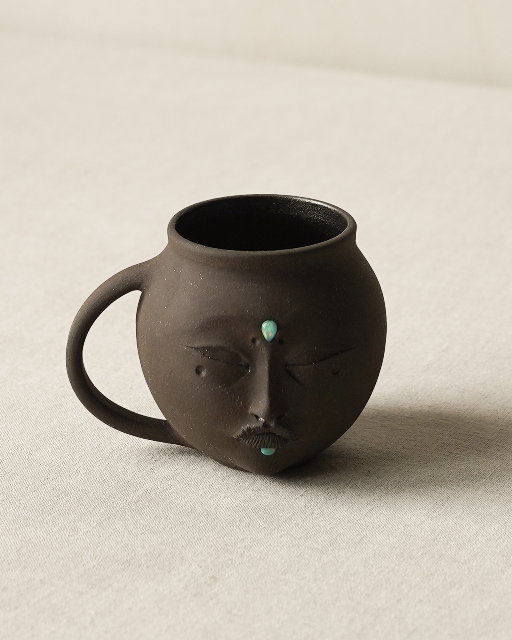 Dark stoneware finished with a shimmer wash and set with Ethiopian opal stones that catch the light against the matte black surface. The hand-sculpted face emerges from the inky clay with a kind of weighted stillness.