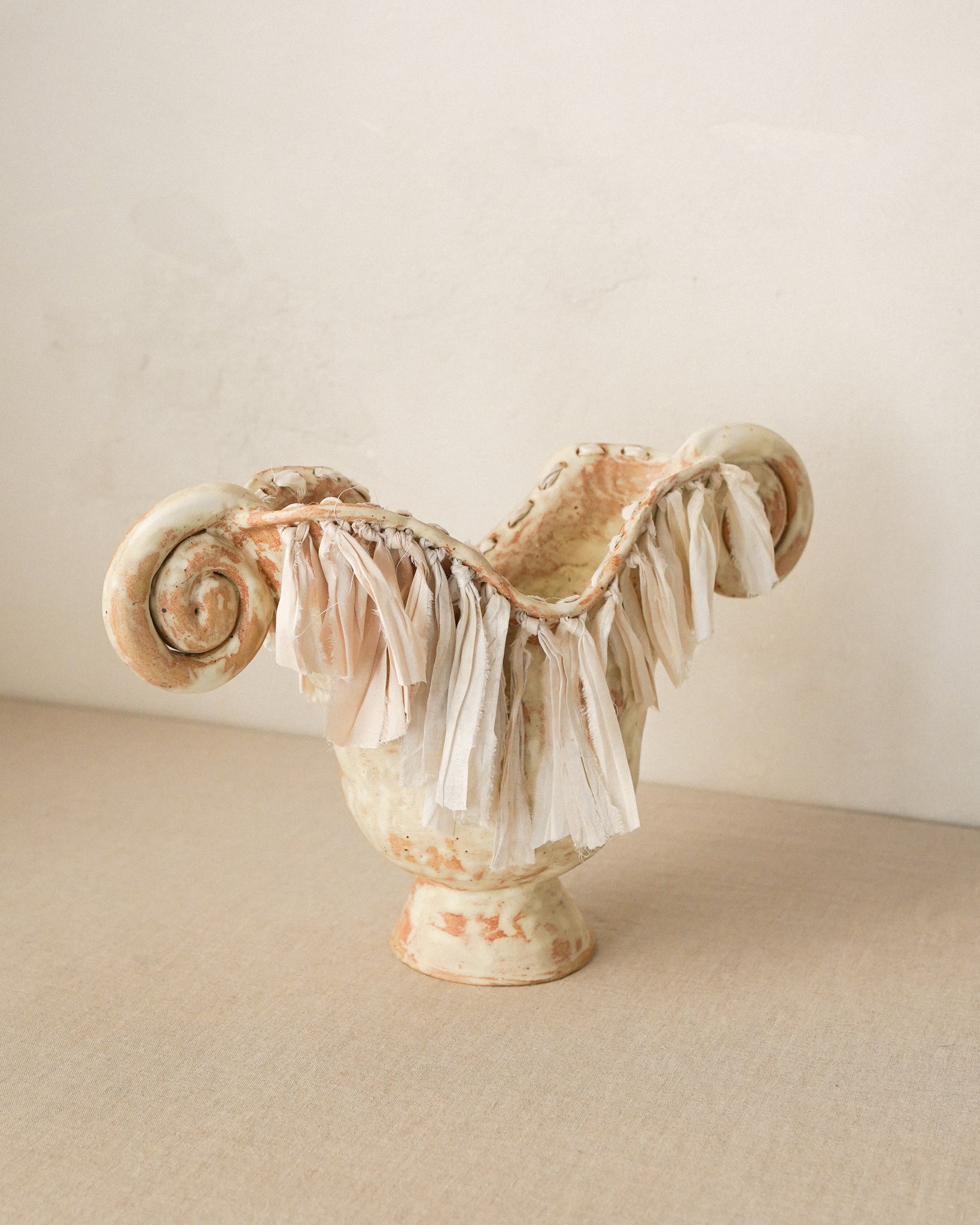Tylen's fascination with Schiaparelli's play on form comes to life through the draped silk accents that echo the gown's cascading tassels. Hand-built in her Dallas studio, this vessel represents the intersection of fashion and functional art, creating a piece that brings runway sophistication to your tabletop or display.