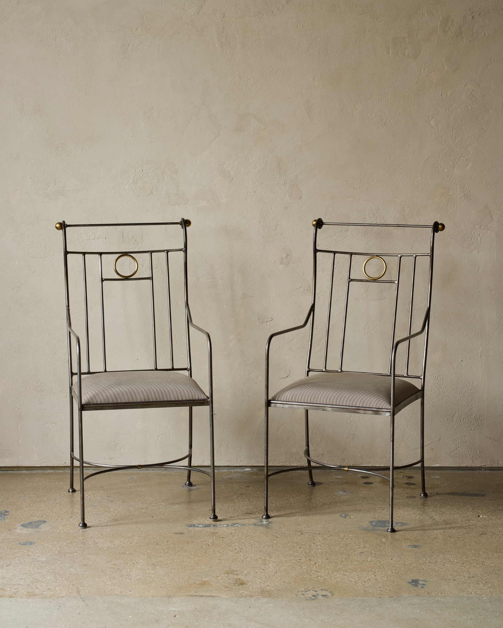 Natural verdigris patina and hammered texture give these French dining chairs from the 1940s striking weathered character. The hand-forged metalwork and aged green finish bring sculptural presence to a dining table or work beautifully as standalone accent seating.Â