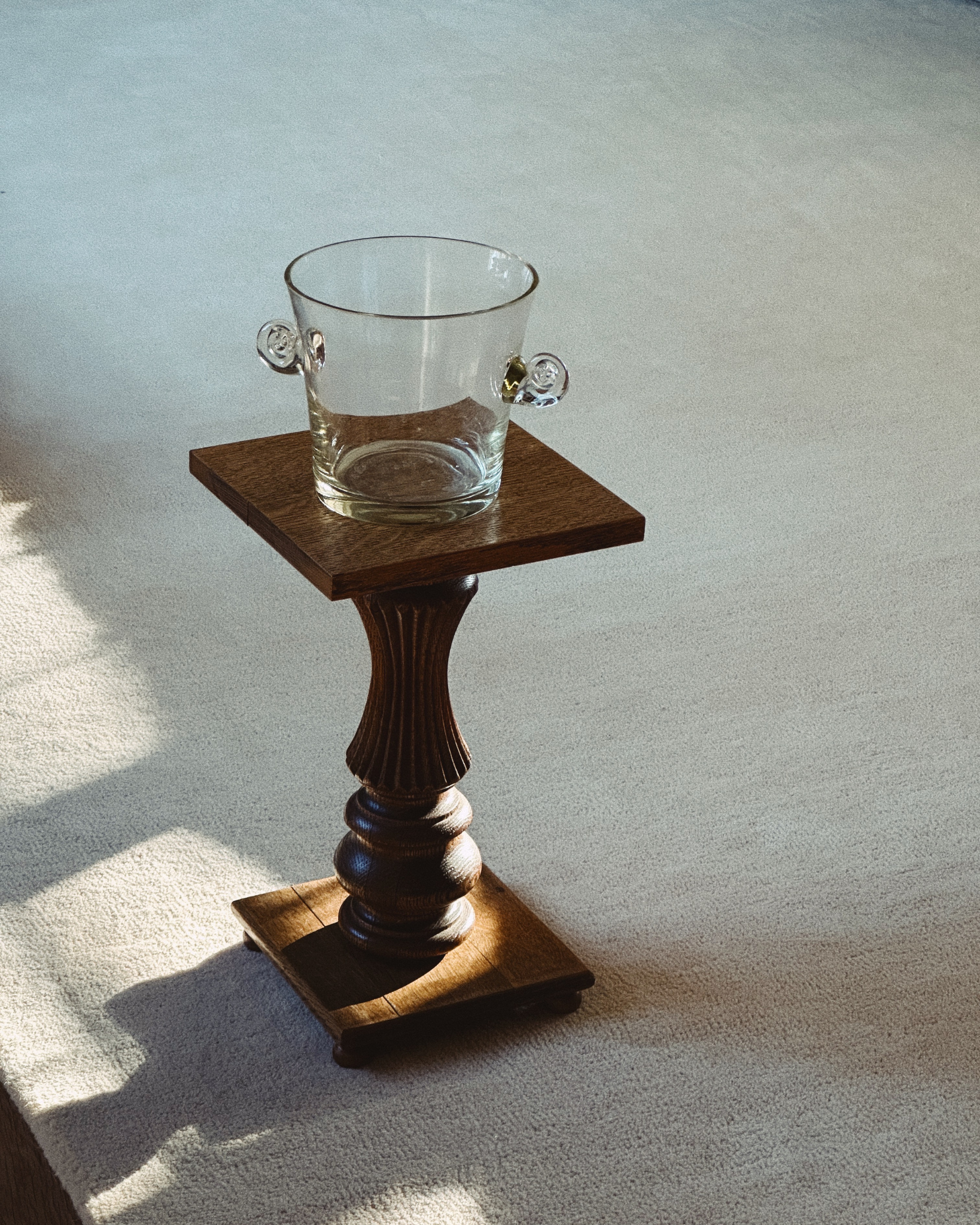 Glass ice bucket with scroll glass handles and generous proportions. The quality glasswork and elegant details make it well-suited for bar service or chilled wine presentations.