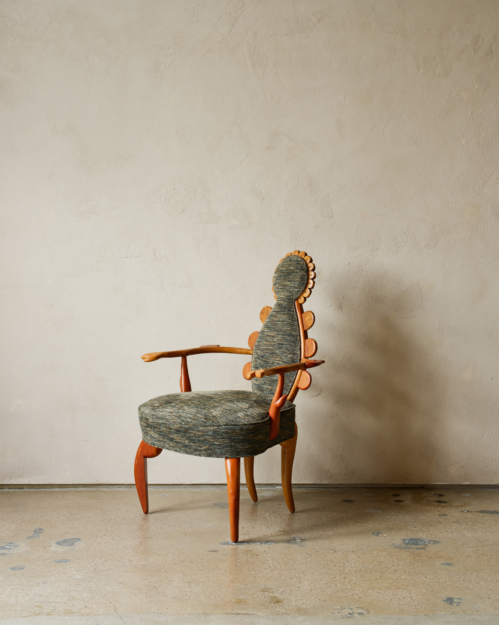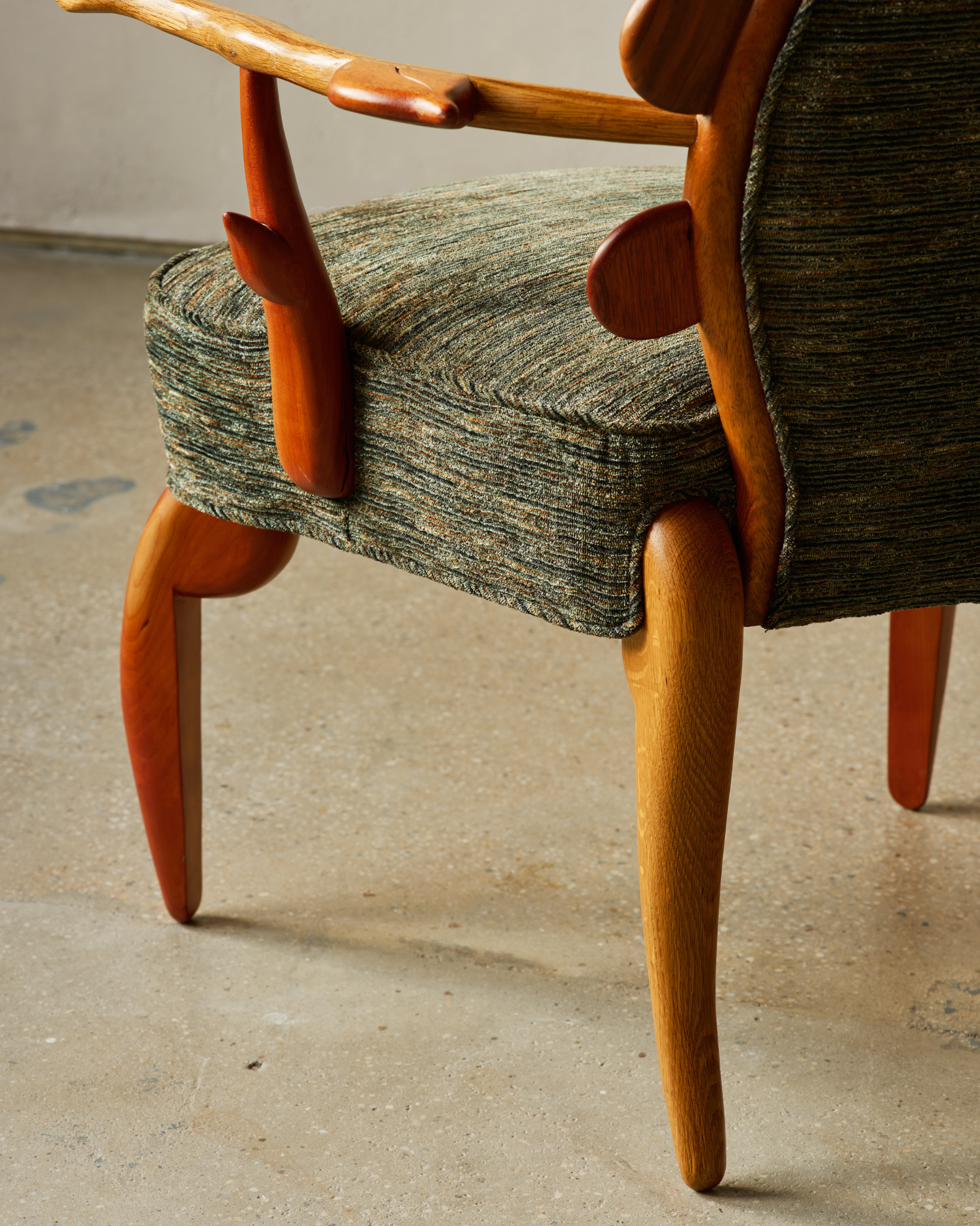 Multiple wood species come together in this handcrafted armchair that blurs the line between furniture and sculpture. The expressive construction makes it a conversation piece—plant it in a study, bedroom, or anywhere a space needs artistic punctuation and a very comfortable seat.