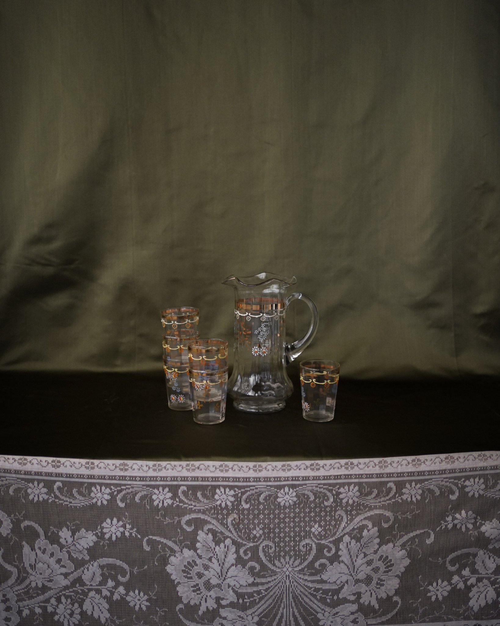 Gold and enamel accents embellish this seven-piece glass beverage service from the Victorian era. The handled pitcher and six matching cups feature ornate gilded decoration.