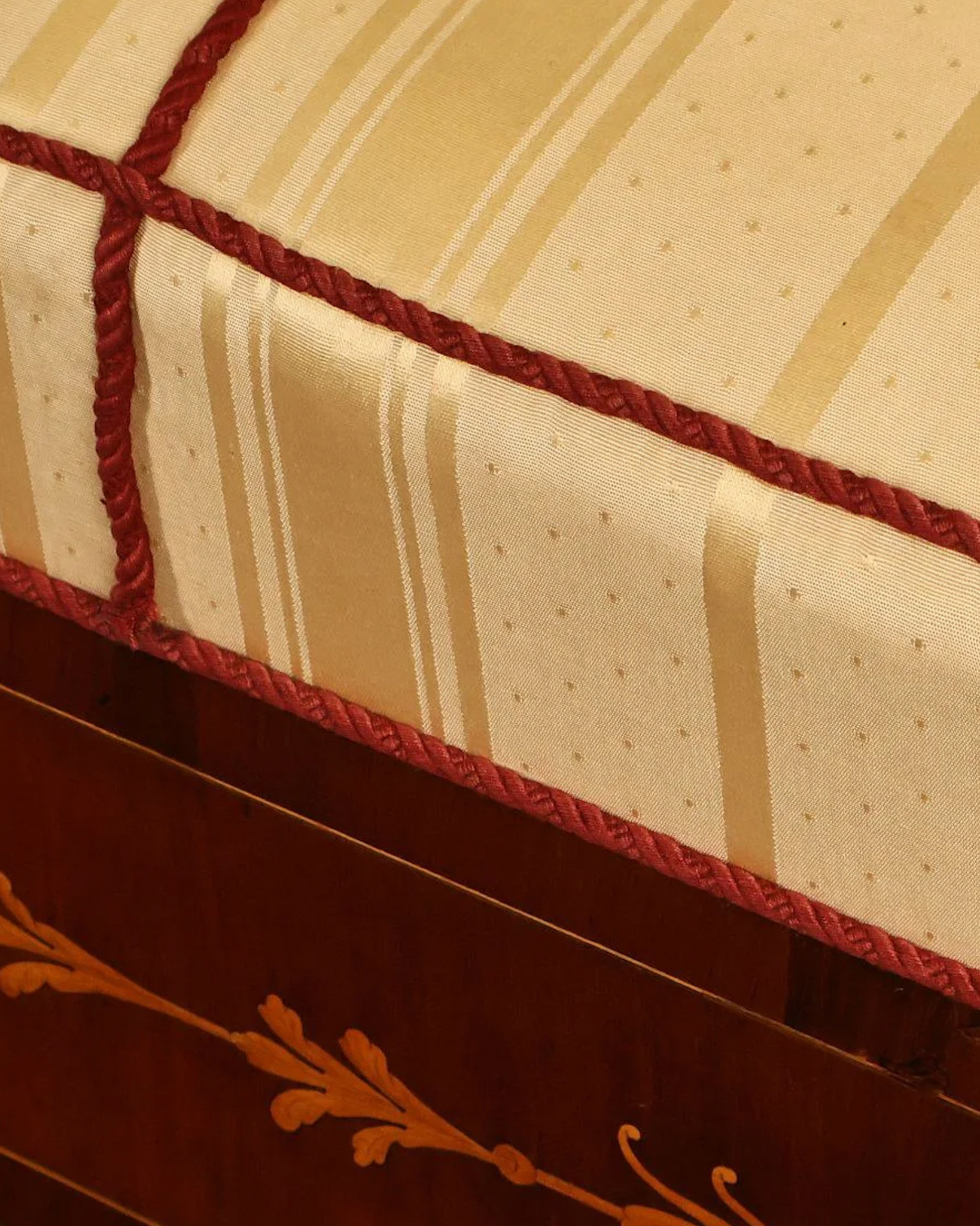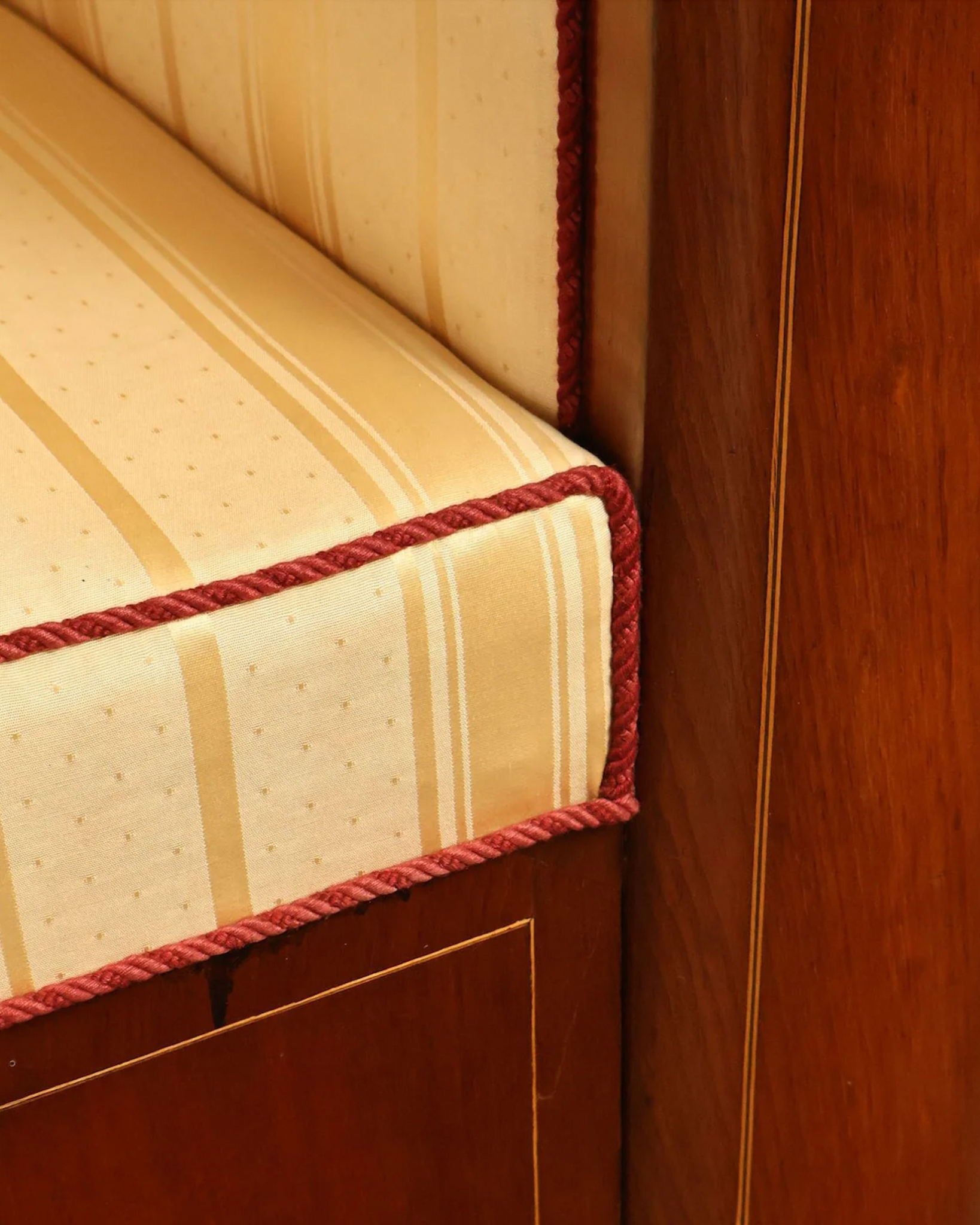 Features gold striped upholstery with burgundy cord trim and matching bolster pillows. Vintage/used condition with imperfections and general wear to the upholstery.