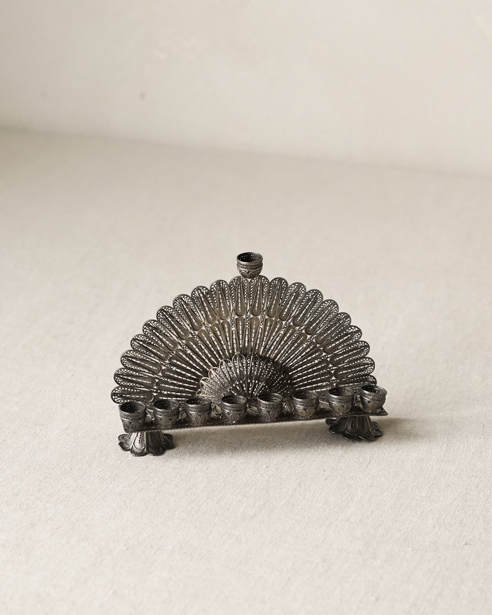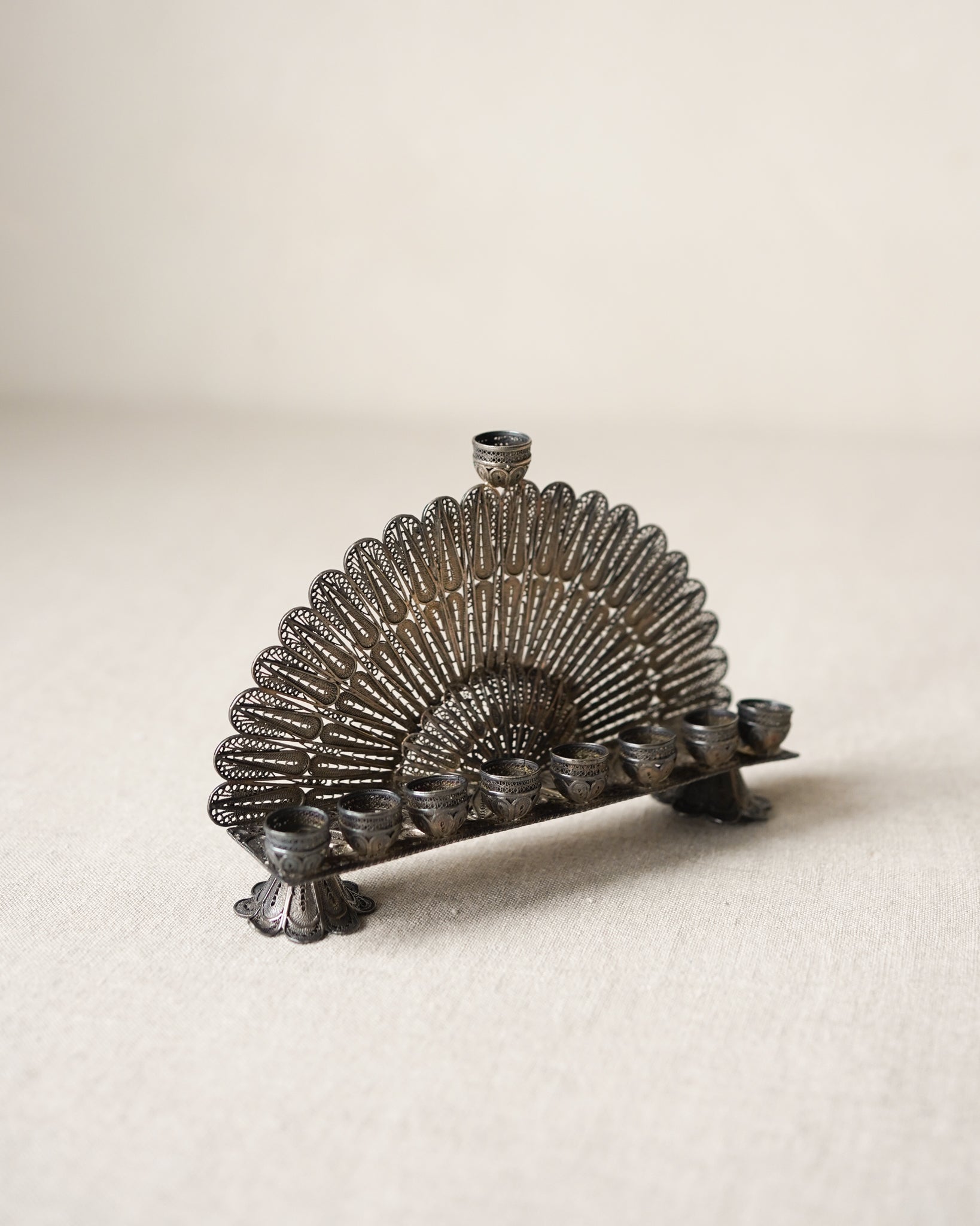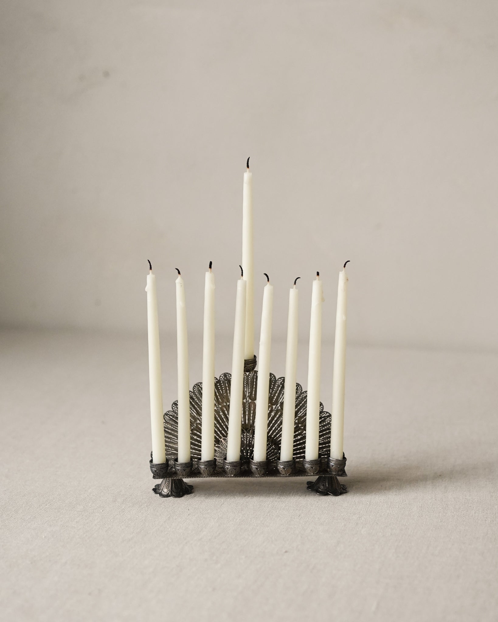 Intricate filigree work transforms sterling silver into delicate patterns across this vintage menorah. The ornate metalwork demonstrates traditional silversmithing, where fine wire is carefully shaped and soldered into decorative motifs that catch and reflect candlelight.