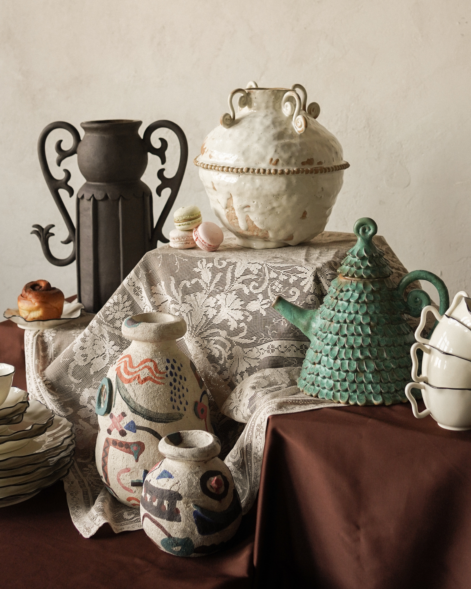 This hand-built vase by Bella Tylen features her signature spiral handles that nod to Grecian architecture, echoing the curves of Ionic columns while remaining distinctly playful and personal. The cream-glazed stoneware vessel leans into slightly tilted, imperfect balance, celebrating forms that feel alive rather than rigidly classical.